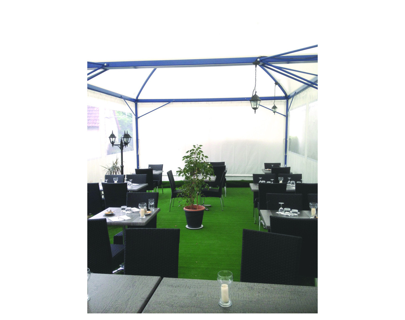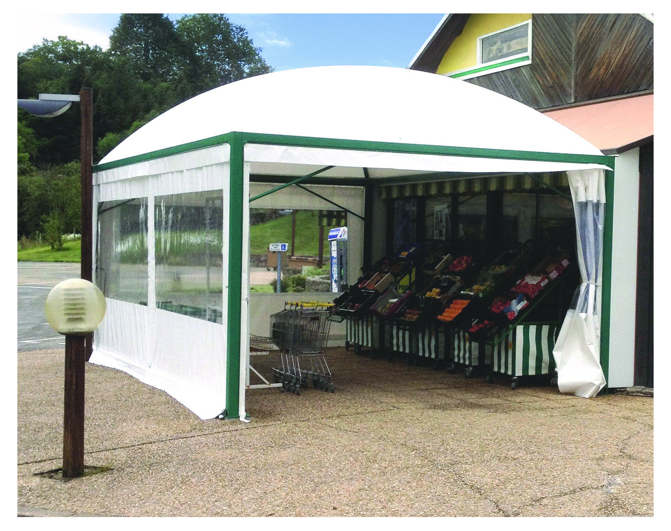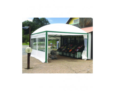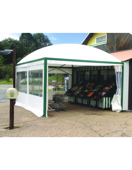 Toit : toile PVC 650 g/m² classé au feu M2. Coloris blanc ou autres coloris avec plus-value.