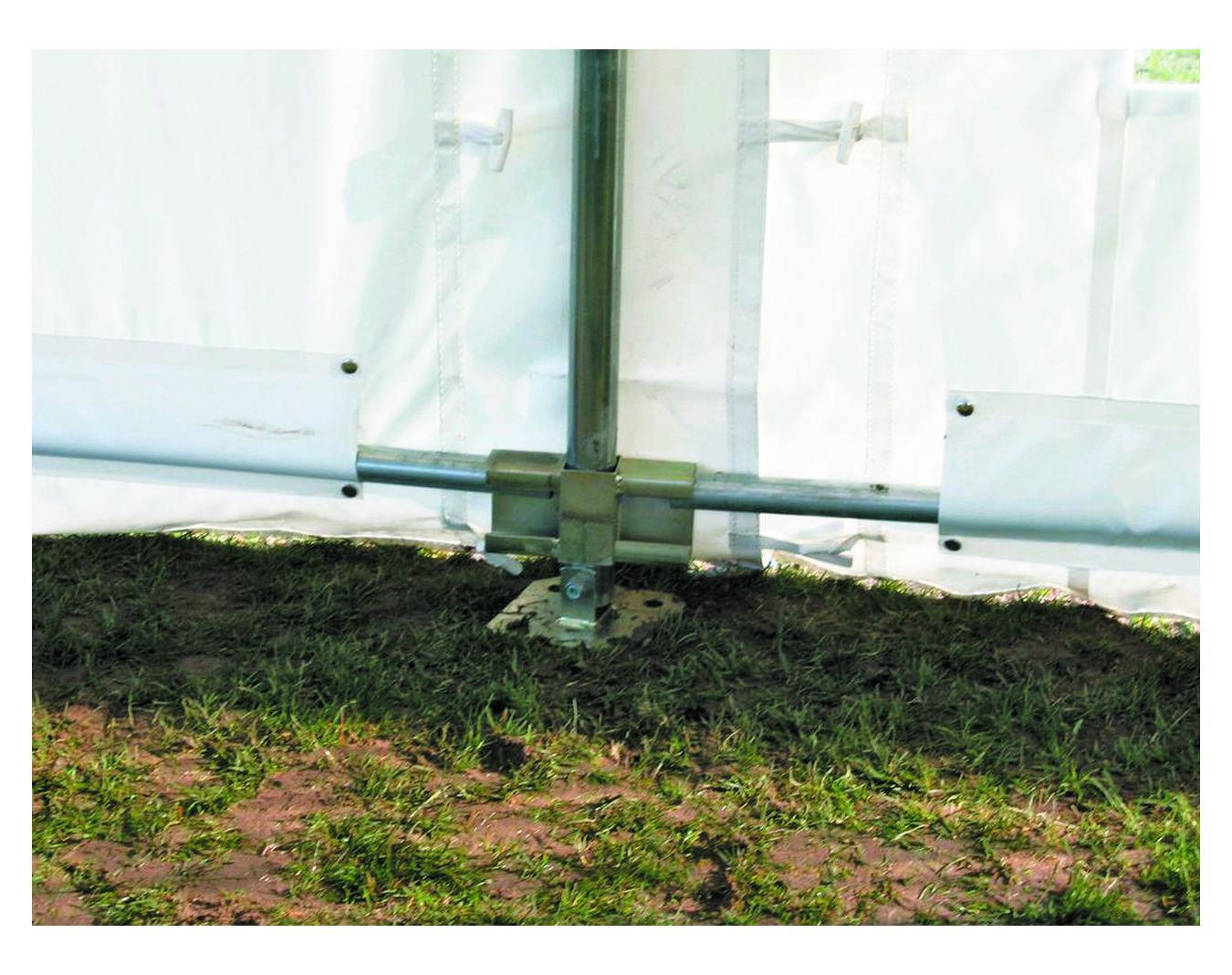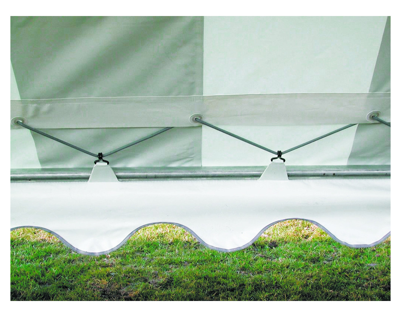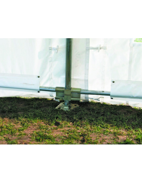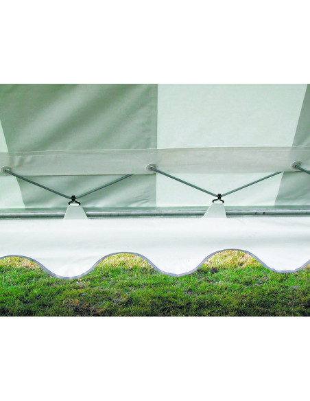 Structure : acier galvanisé, tube Ø 40 mm (pour les largeurs 300 et 500 cm) et Ø 60 mm (pour les largeurs 600 et 800 cm). Épaisseur 2 mm. Travée de 400 cm. Assemblage sans visserie.