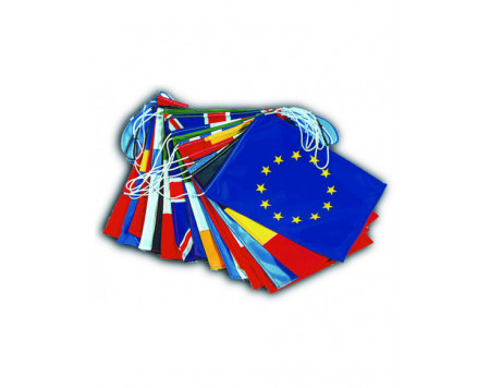 Guirlande des pays européens : 28 pavillons de chaque pays de l'Union Européenne et le drapeau de l'U.E. En plastique. Pavillon : 20 x 30 cm. Longueur : 10 m.