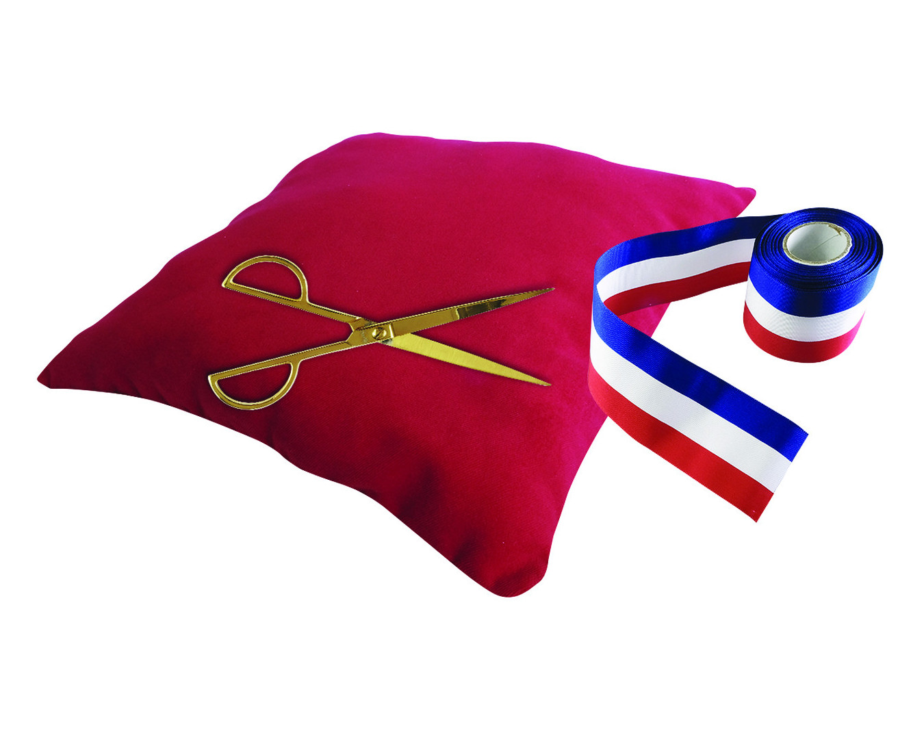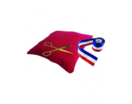 Lot composé de : 1 coussin en velours rouge 35 x 35 cm. 1 paire de ciseaux dorés. 1 rouleau de 10 m de ruban tricolore larg. 48 mm.