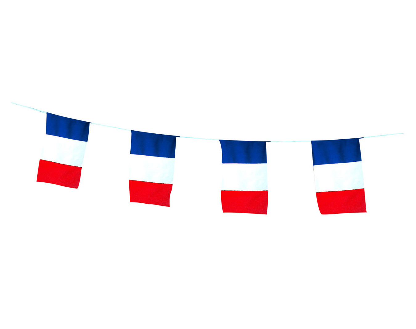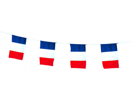 Guirlande tricolore. Pavillon : 20 x 30 cm. En maille montée sur drisse ou en PVC sur biais. Longueur : 5 ou 10 m.