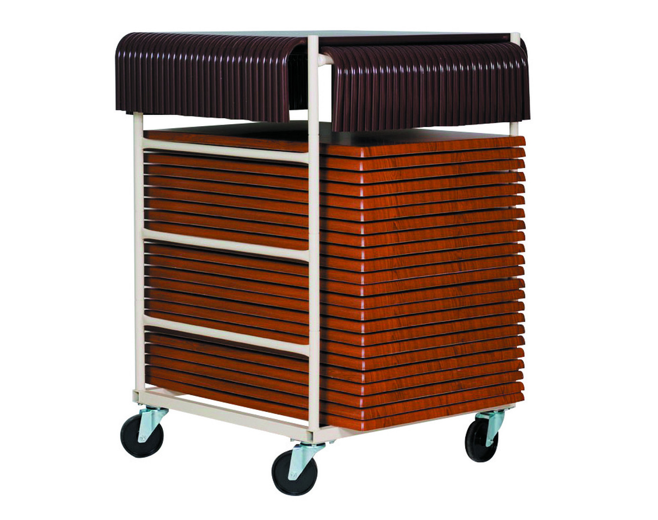 Chariot Entretoises + plateaux : Dimensions : long. 100 x larg. 100 x haut. 160 cm. Capacité : 30 plateaux en multiplis ou mélaminé ou 24 plateaux en stratifié + 60 entretoises.