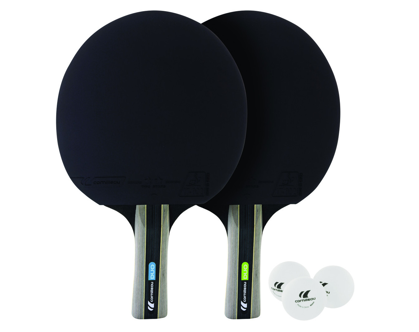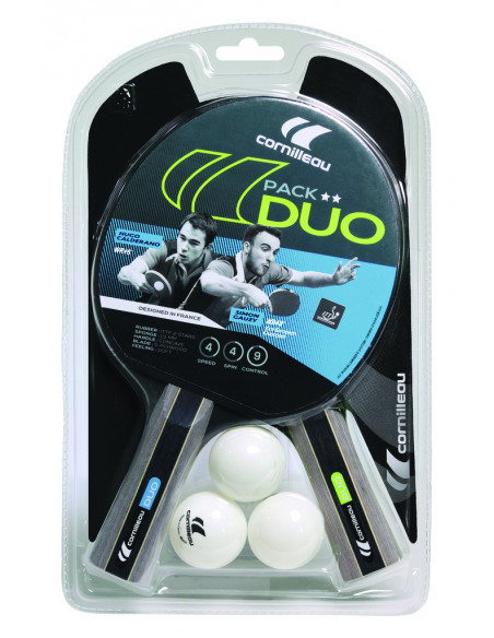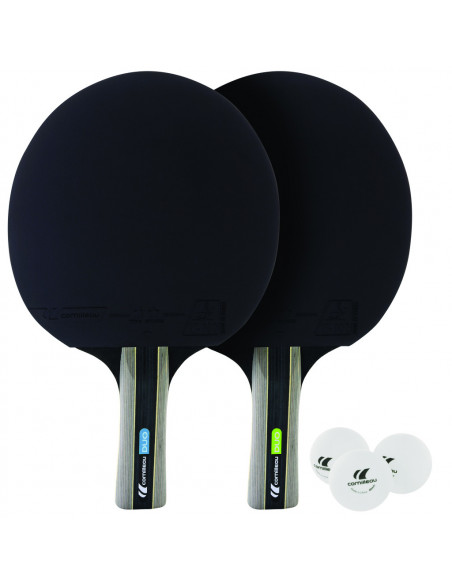 Pack Duo comprenant 2 raquettes de ping-pong et 3 balles. Structure des raquettes en bois nordique ép. 5 mm, manche concave avec une couche de mousse ép. 1,5 mm.