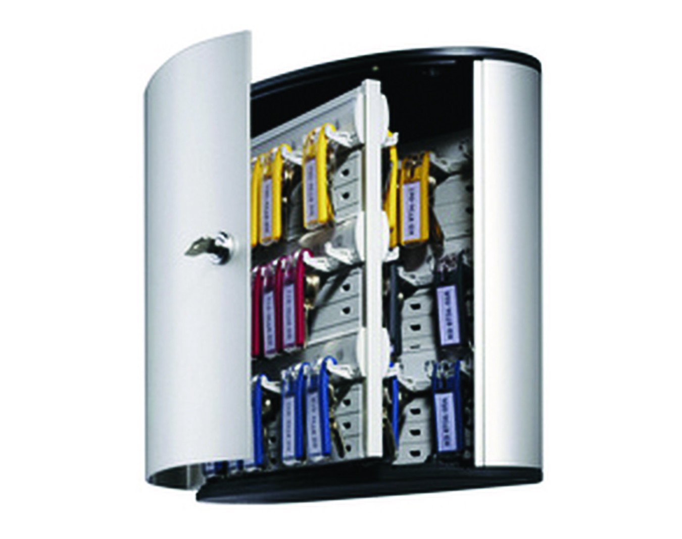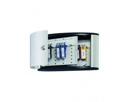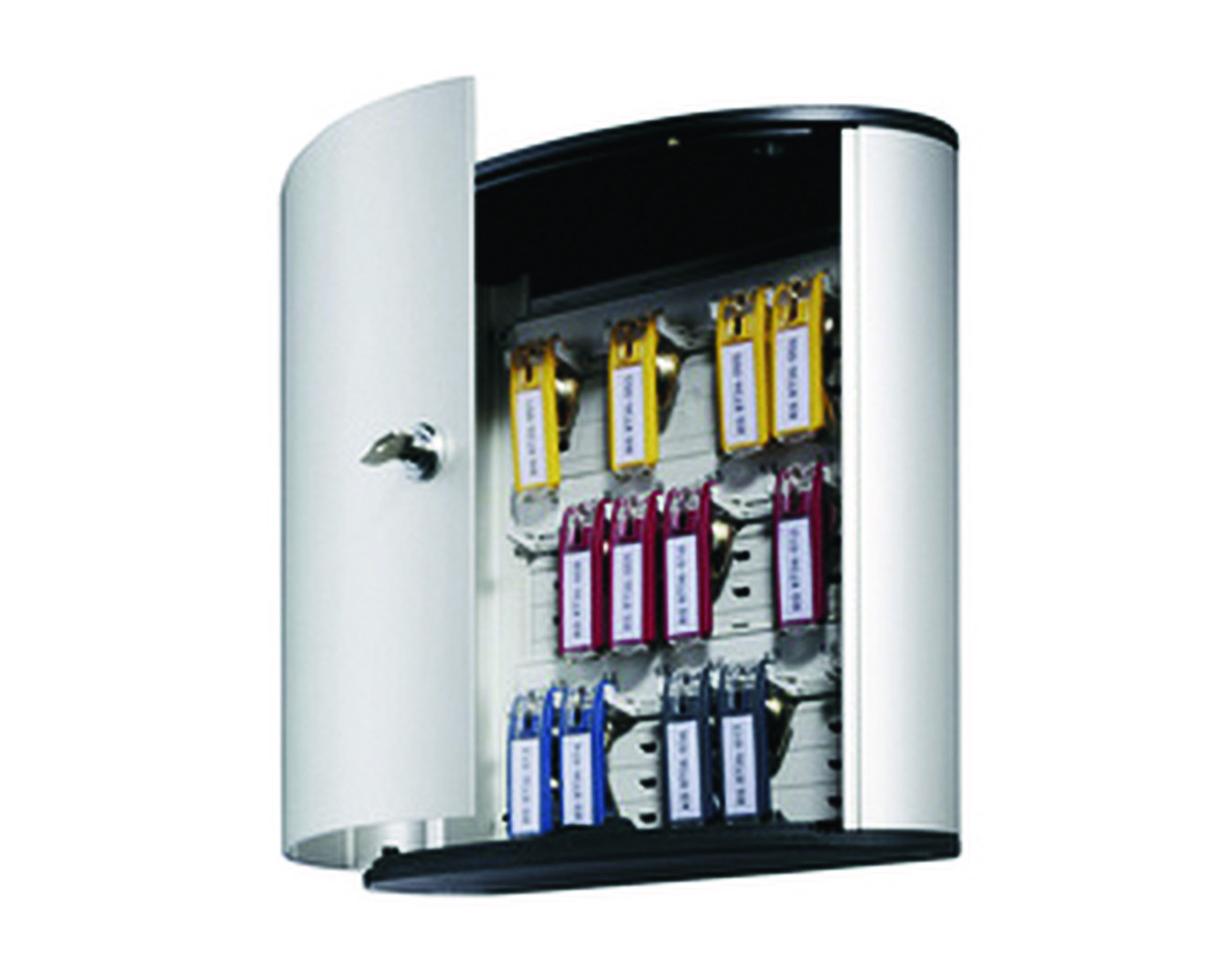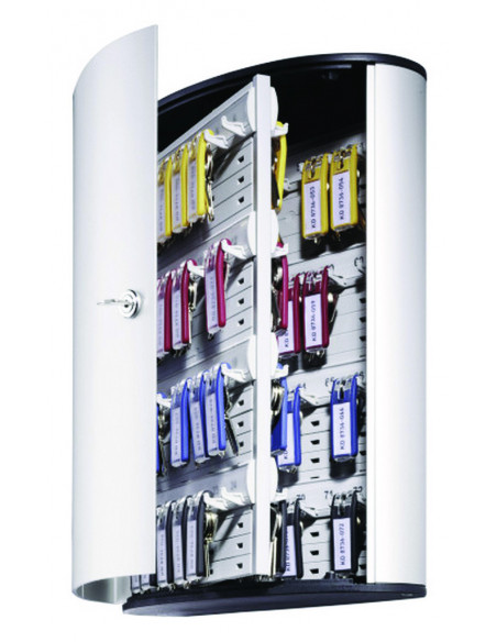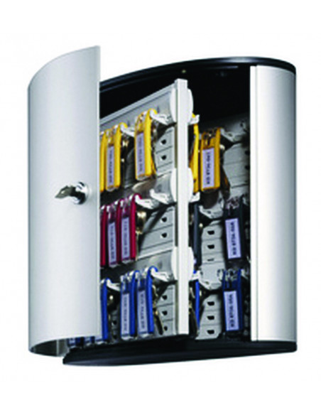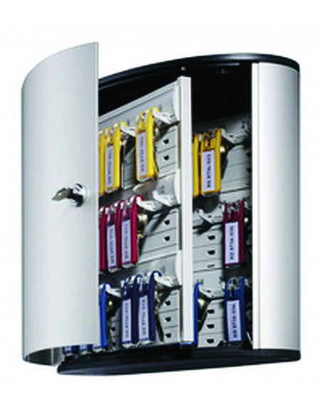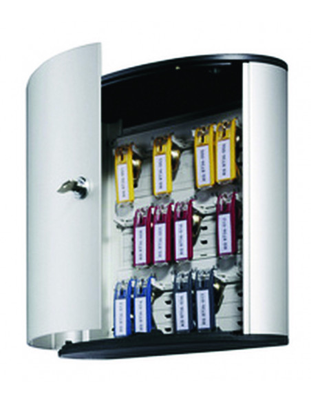 Armoire à clés réalisée en aluminium coloris argent métallique. Ouverture de la porte à plus de 90°. Capacité : de 12 à 72 clés. Compatible avec porte-clés "Key clip". Porte-étiquette pour registre...
