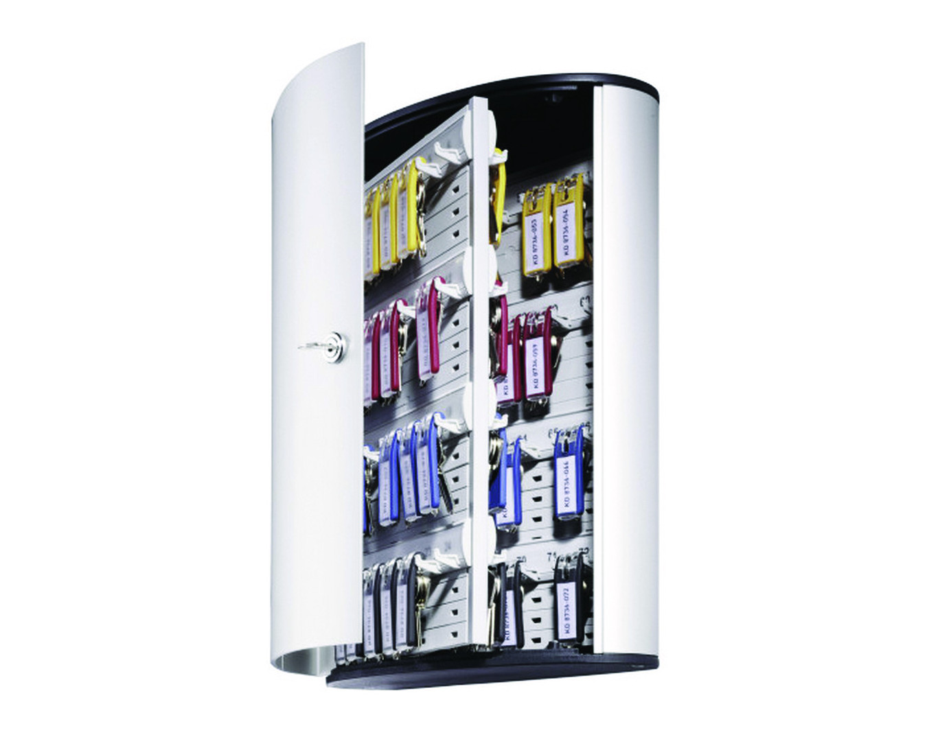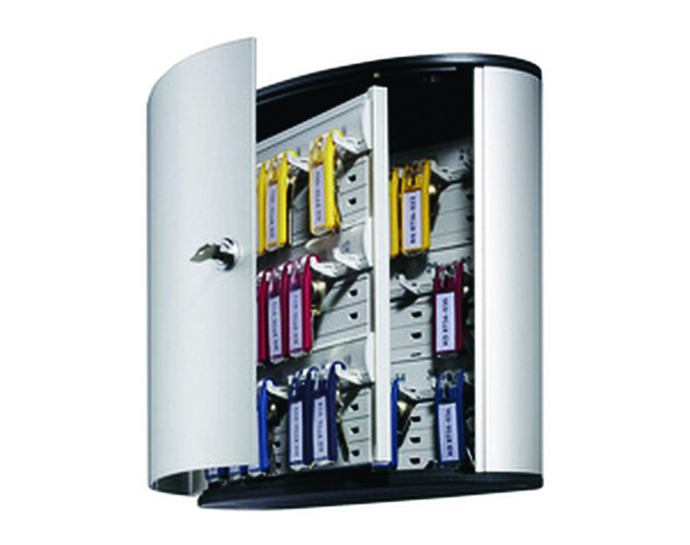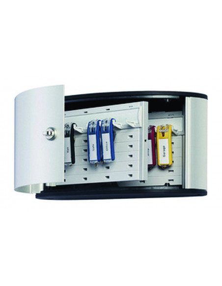 Armoire à clés réalisée en aluminium coloris argent métallique. Ouverture de la porte à plus de 90°. Capacité : de 12 à 72 clés. Compatible avec porte-clés "Key clip". Porte-étiquette pour registre...