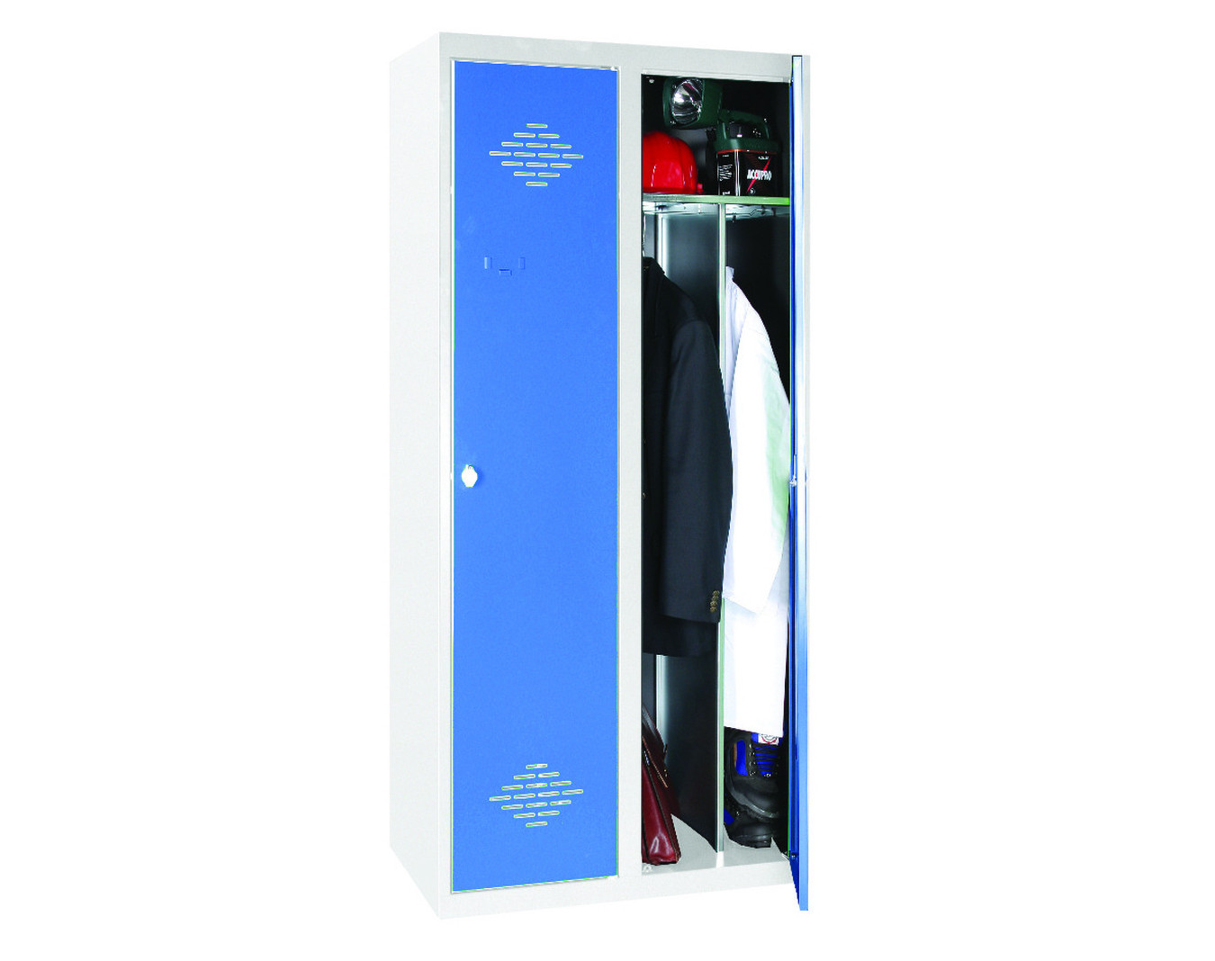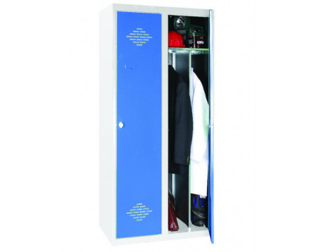 Équipement : tige porte-cintres, tablette, aération haute et basse sur la porte, porte-étiquette embouti. Une cloison sépare les 2 compartiments.