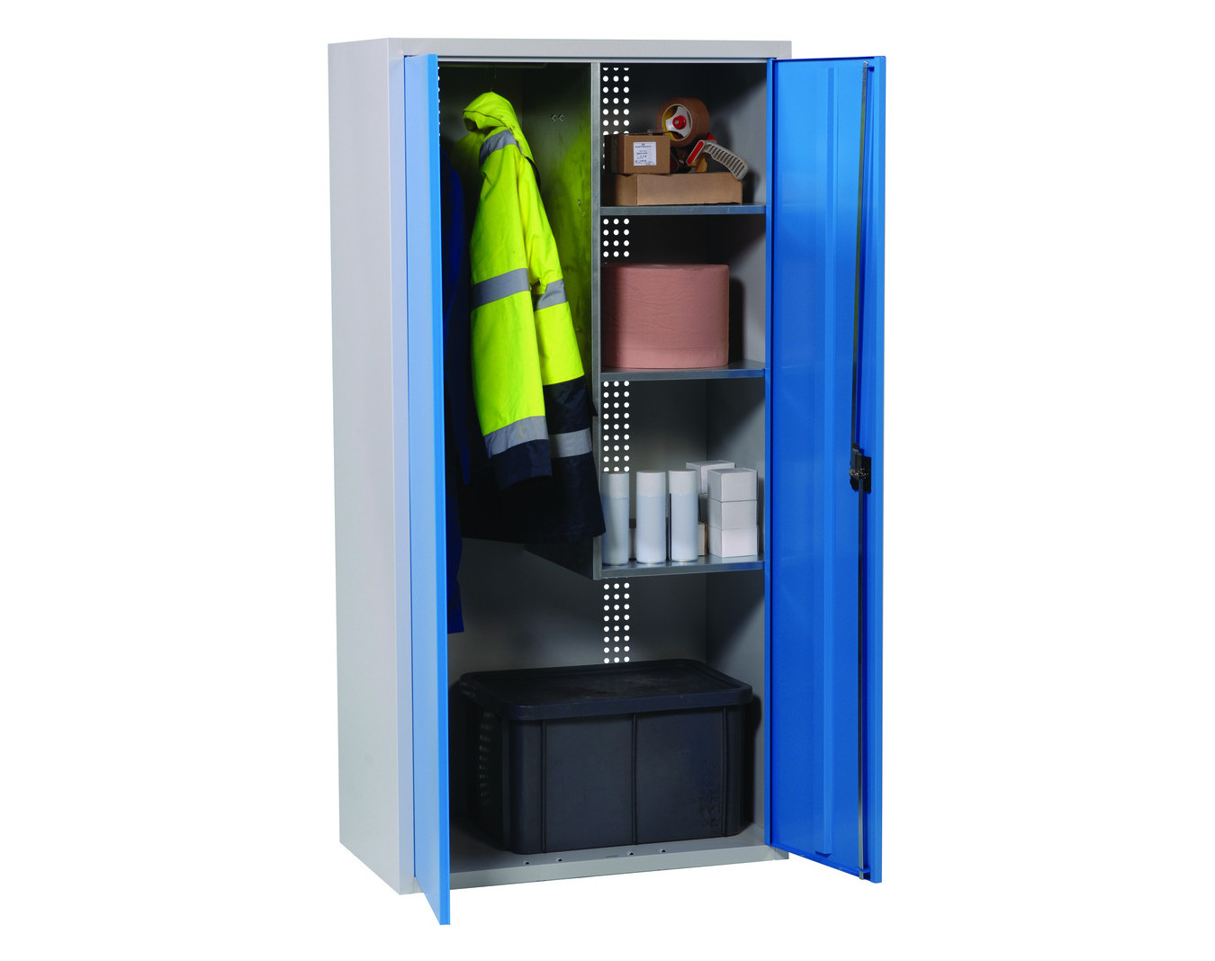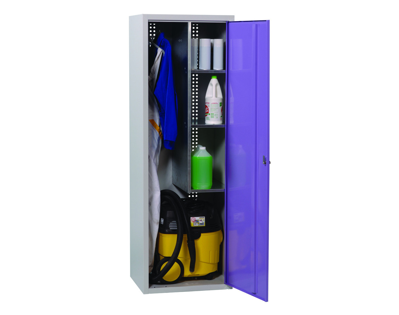 Armoire de ménage. Structure réalisée en tôle construction monobloc soudée, tôles laminées à froid 7 et 9/10e. Coloris corps et portes au choix (voir nuancier). Portes sur pivots invisibles (modèle...