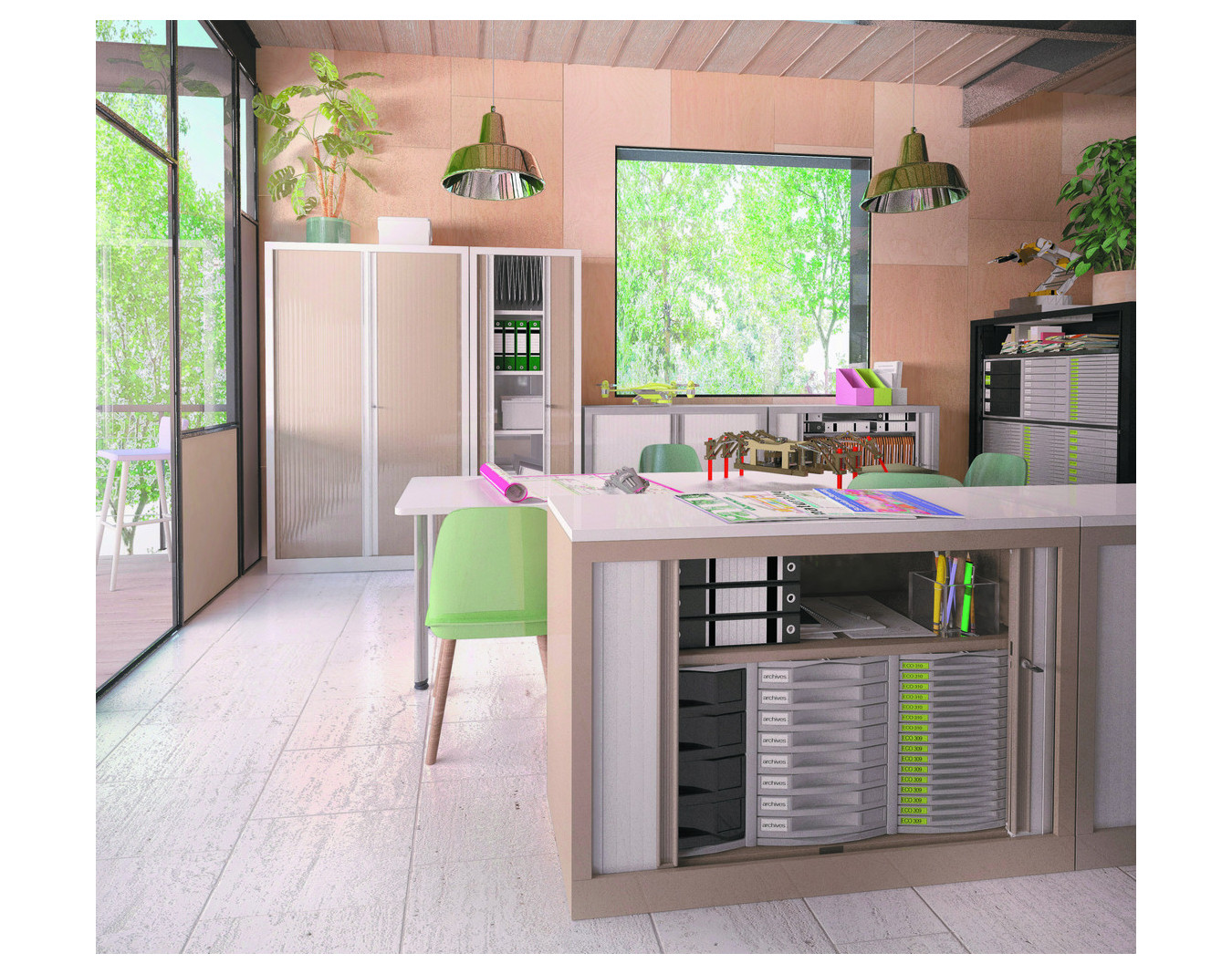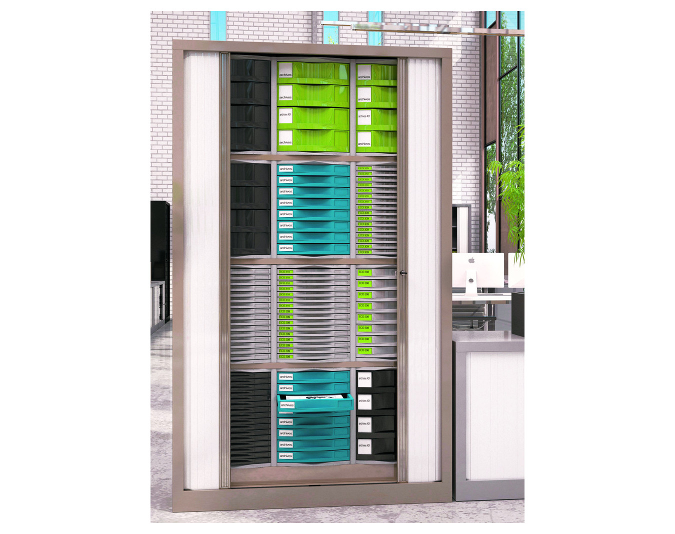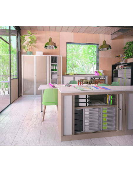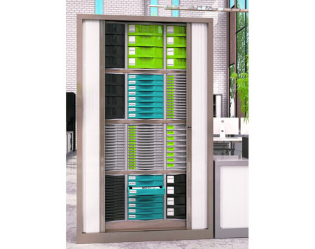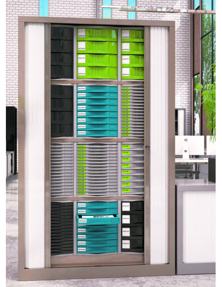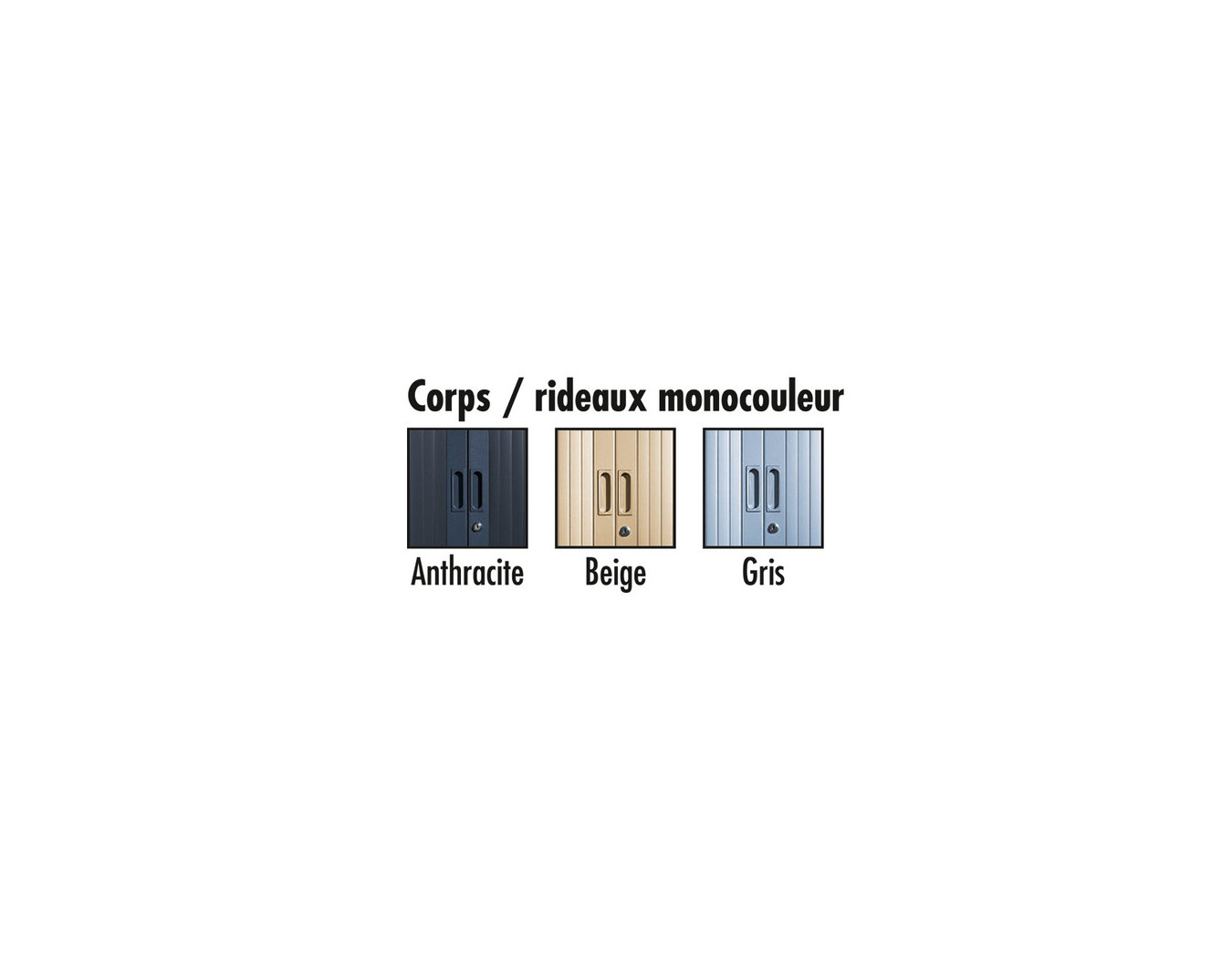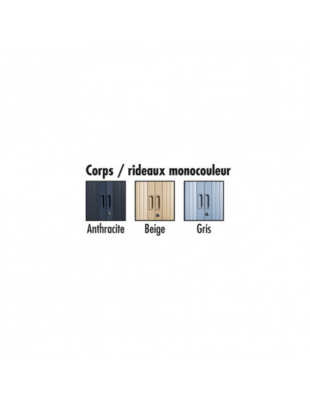 Rideaux : ouverture totale en lames de 30 mm, entièrement escamotables. Rideau PP classé non feu M3. Poignées filantes sur toute la hauteur, coloris assorti au corps de l’armoire. Serrure par came à 90° anti-crochetage.