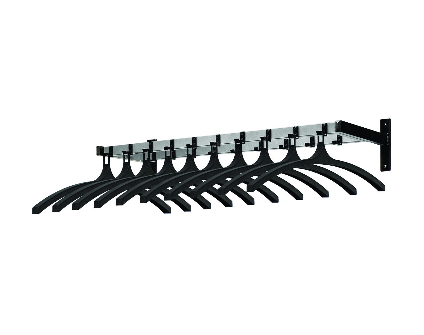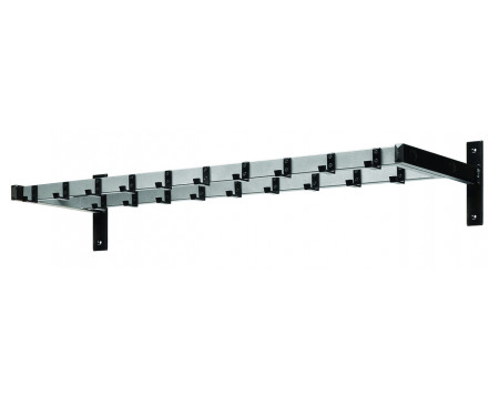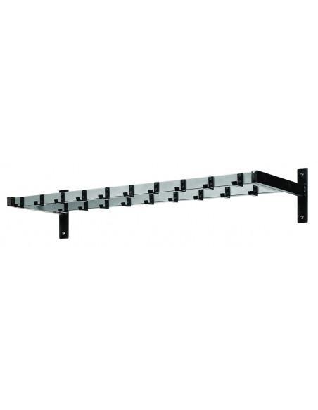 Patère murale double rangée coloris noir et gris aluminium, avec 19 crochets au total. Dimensions : long. 113 x larg. 35 x haut. 20,8 cm. Possibilité de déposer des accessoires sur le dessus.