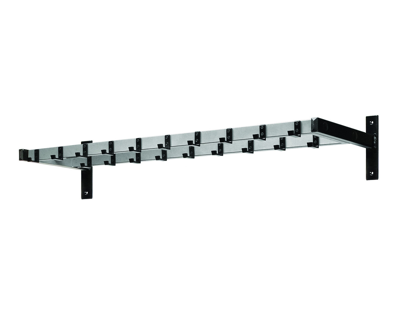 Patère murale double rangée coloris noir et gris aluminium, avec 19 crochets au total.