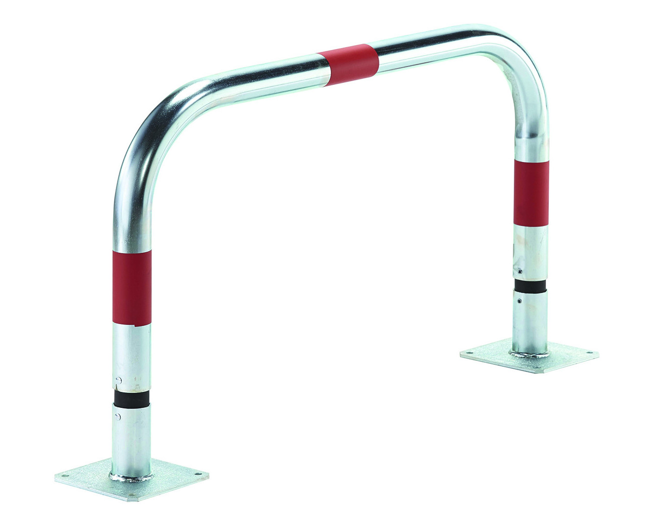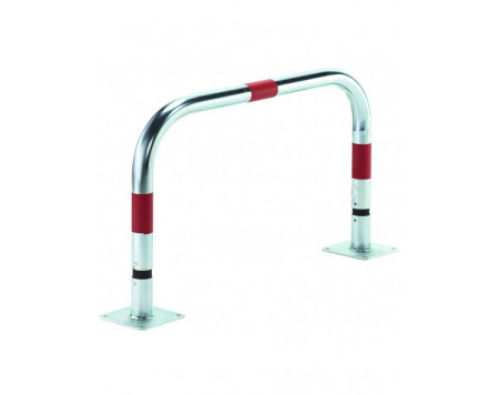 Bloc parking réalisé en acier zingué avec 3 bandes rouges. Arceau Ø 50 mm avec amortisseurs caoutchouc. Résiste aux chocs. Dimensions : long. 88 x haut. 54 cm. Encombrement au sol : 98 x 15 cm....