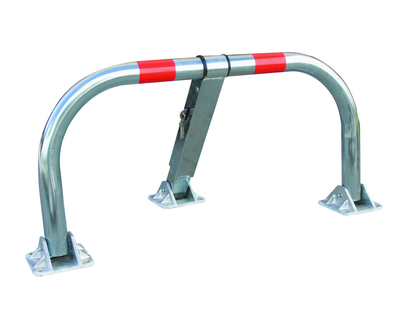 Bloc parking stop en acier zingué avec bandes fluo rouges. Arceau en tube Ø 55 mm avec bagues anti-frottement, monté sur sabots en fonte. Serrure avec clés différentes ou identiques (2 clés...