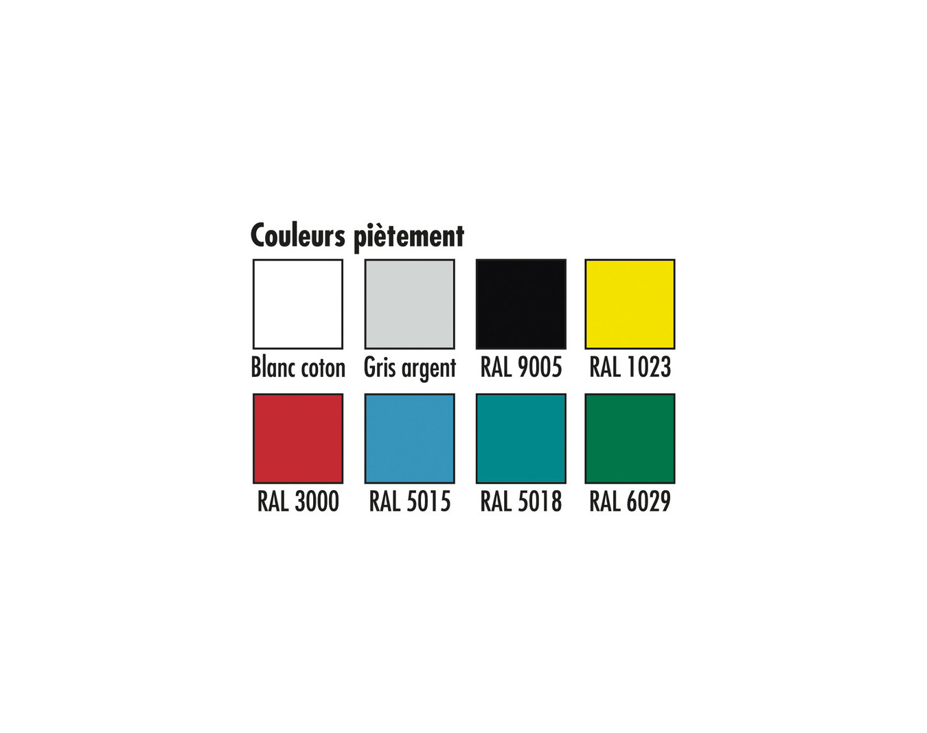 Piètement en tube d’acier Ø 25 mm, épaisseur 1,5 mm, finition peinture époxy, équipé d’un embout de sol en polypropylène noir non tachant.