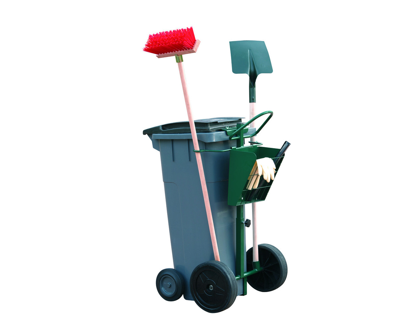 Chariot de voirie pour conteneur. Structure réalisée en acier mécano soudé, finition peinture époxy vert. Dimensions totales : long 61,6 x prof. 36,7 x haut. 118,9 cm. 2 roues en plastique Ø 30 cm...
