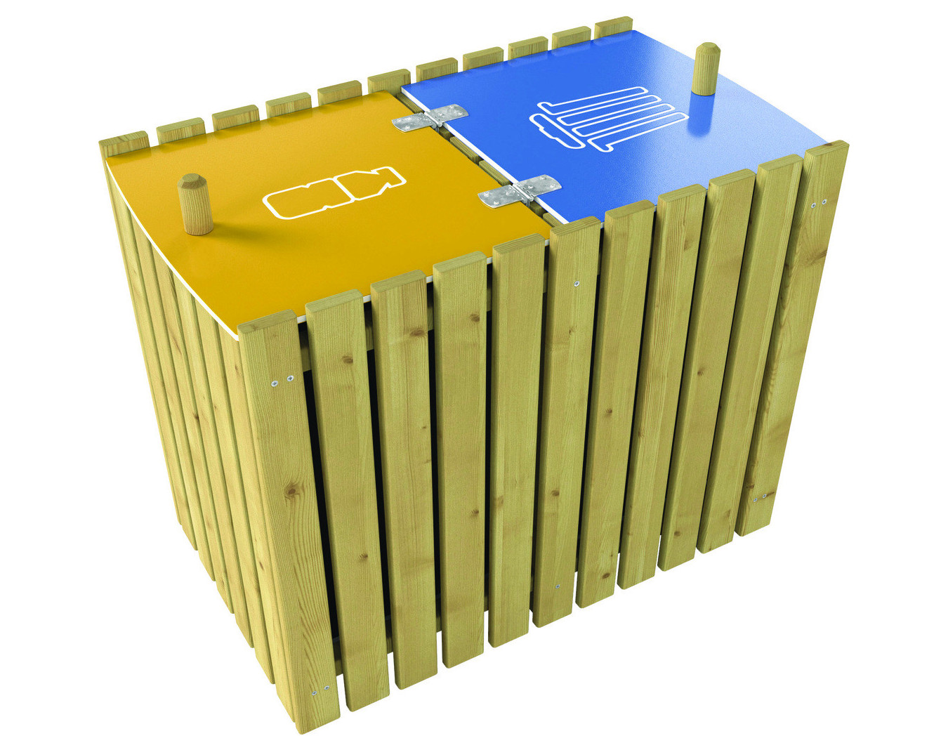 Lot de 2 corbeilles de ville spéciales tri sélectif. Pin traité autoclave classe IV sans Cuivre, Chrome, ni Arsenic. Lames rectangles avec couvercle sur charnière. Maintien du sac poubelle par...