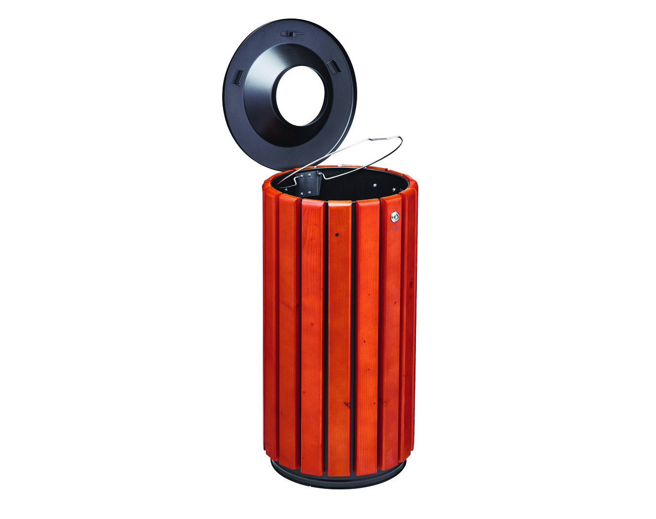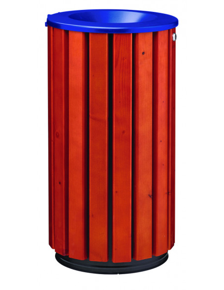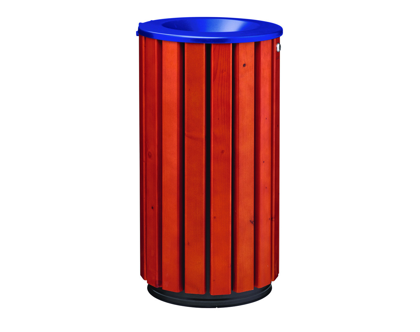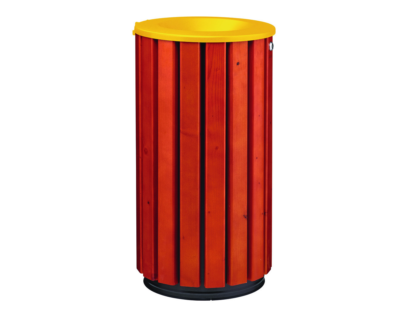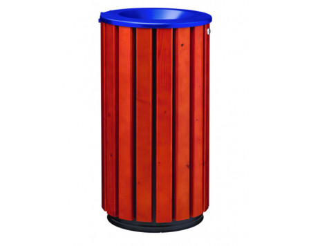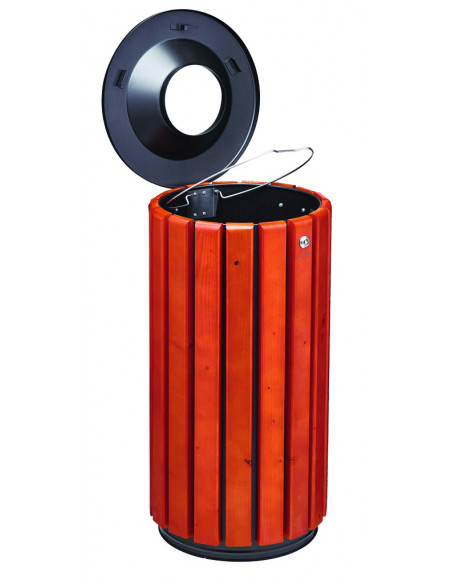Corbeille de rue avec couvercle. Tête et structure porte-lames en acier traité anticorrosion et poudré coloris au choix (voir nuancier). Lames en bois vernis.Tête entonnoir. Serrure à clé triangle....
