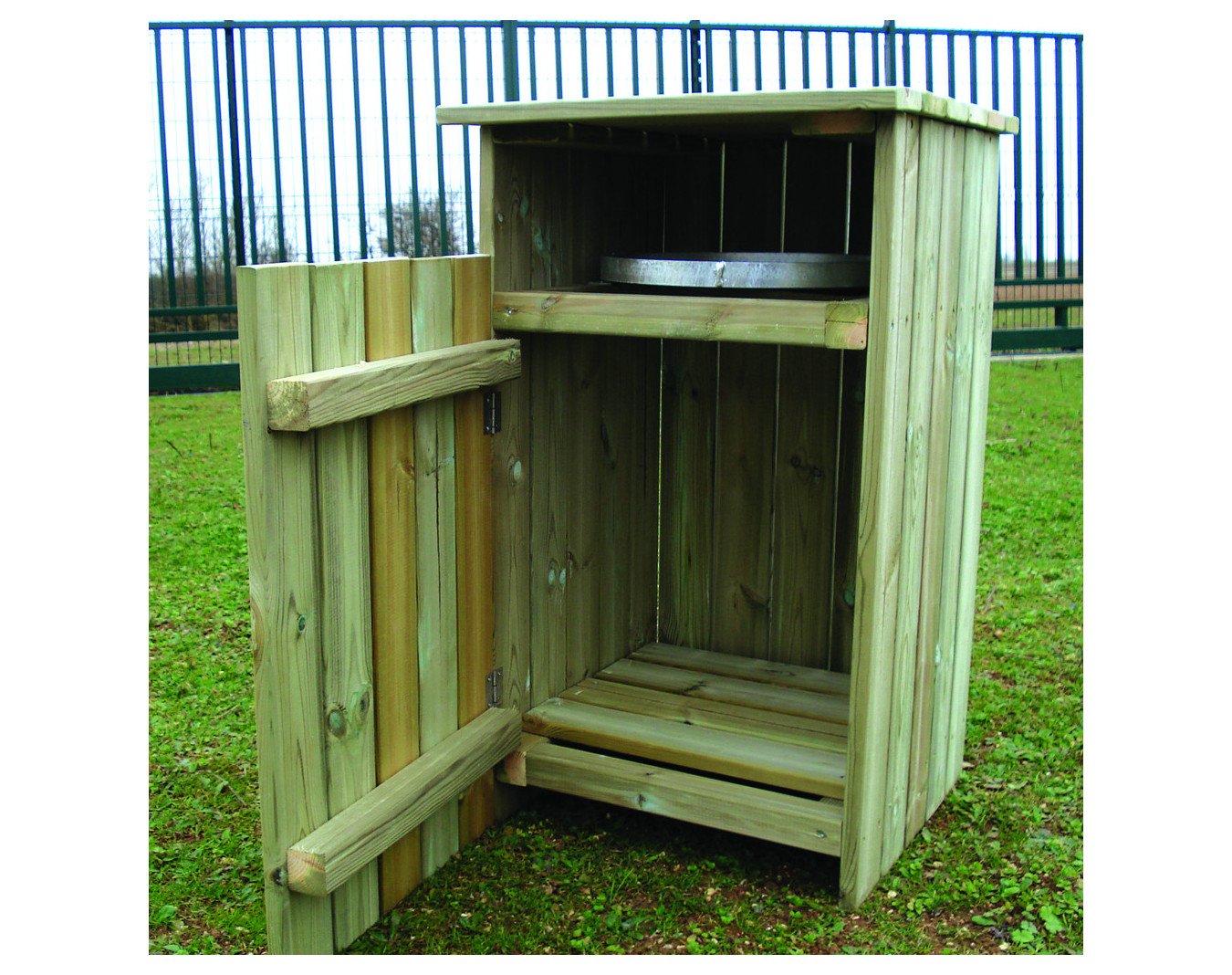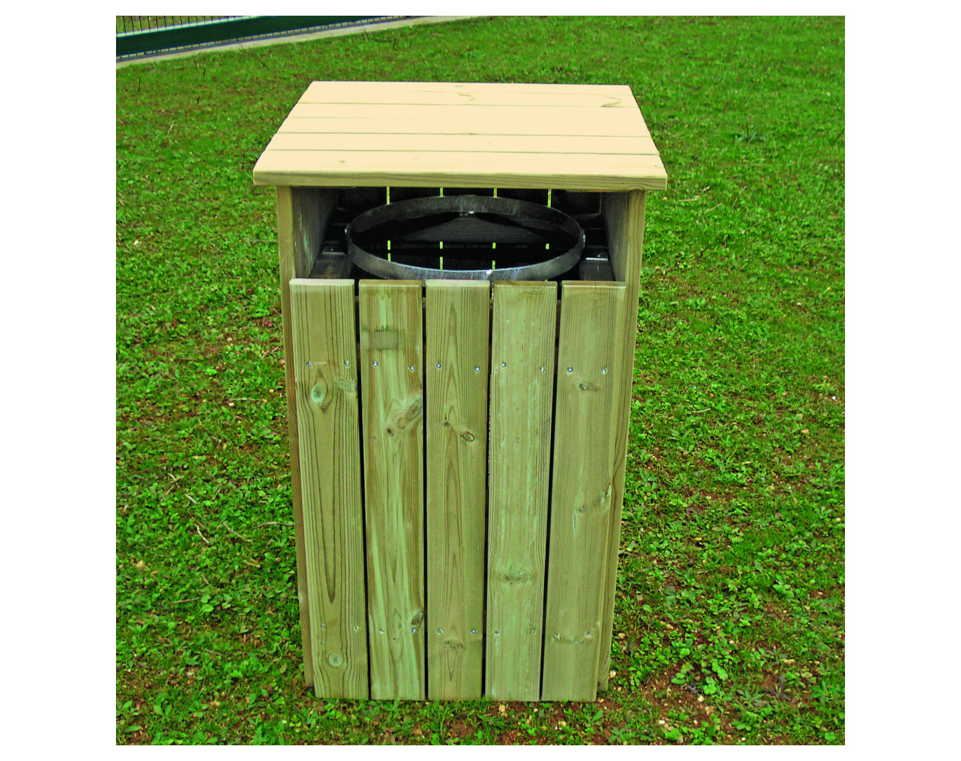 Corbeille bois s'intégrant discrètement à son environnement extérieur.