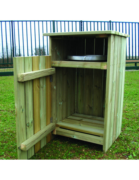 Corbeille bois s'intégrant discrètement à son environnement extérieur. Pin traité autoclave classe IV, certifié CTBP+. Porte avant ouvrante pour retrait aisé du sac. Couvercle en bois. Hauteur :...