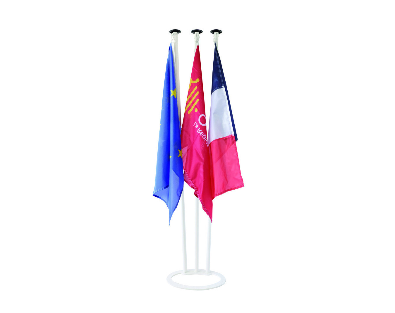 Lot pavoisement : 1 pied porte-drapeaux 3 places + 3 mâts de façade 2 m + 1 pavillon France maille 60 x 90 cm + 1 pavillon Union Européenne 60 x 90 cm + 1 pavillon Province 60 x 90 cm
