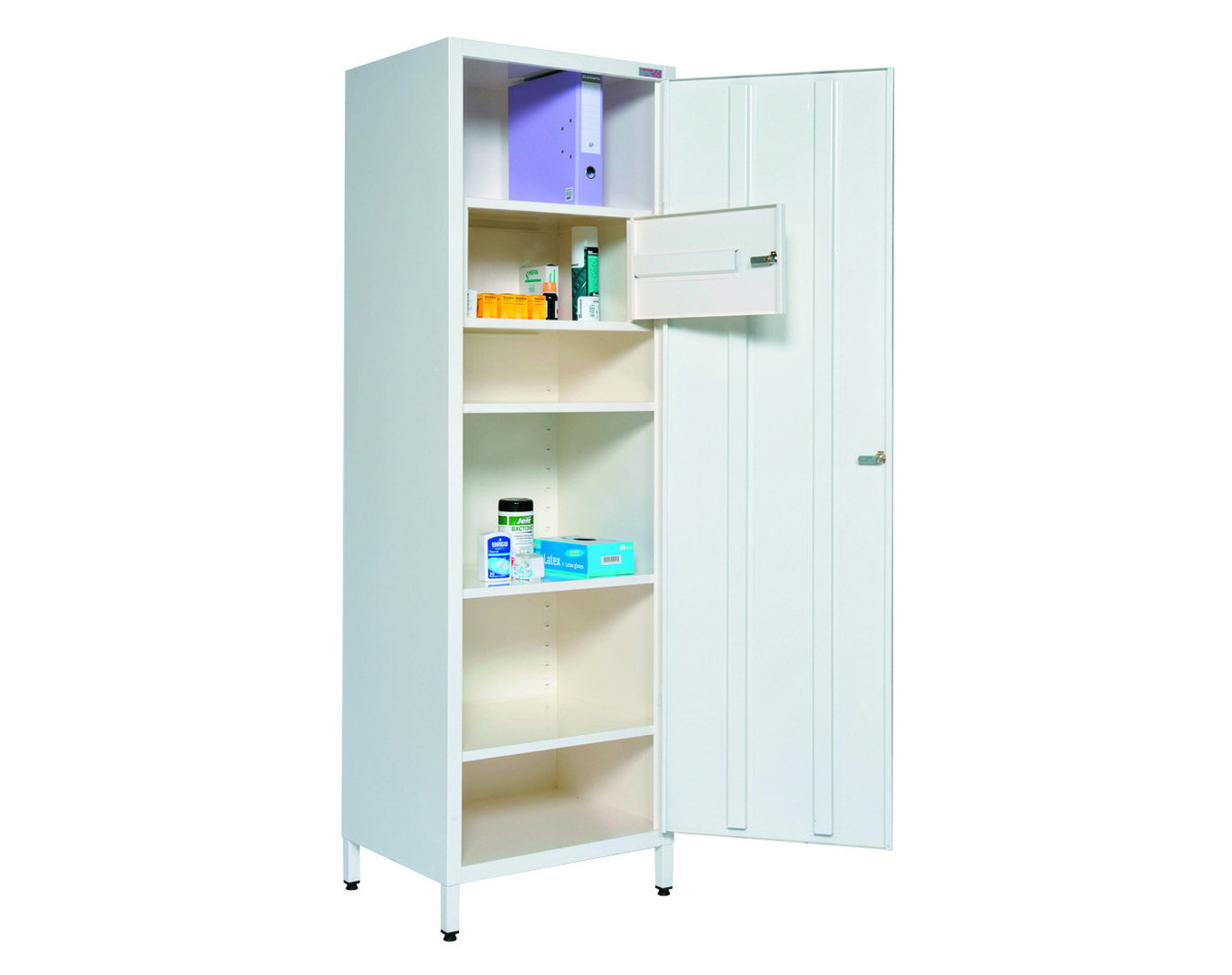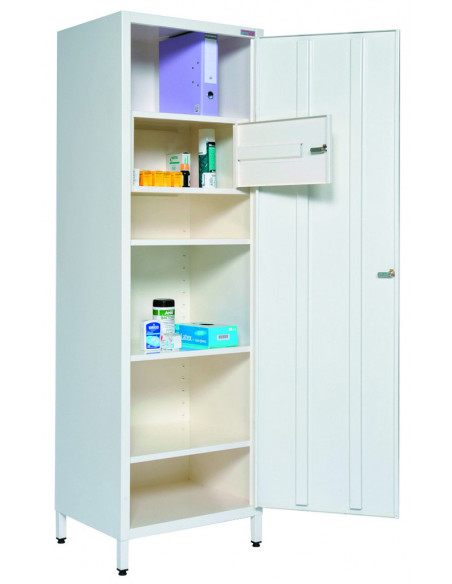 Armoire à pharmacie de grande capacité. Réalisée en acier monobloc soudé, tôles laminées à froid 7 et 9/10e. Finition peinture hydrosoluble cuite au four, coloris blanc. Dimensions d’une armoire :...