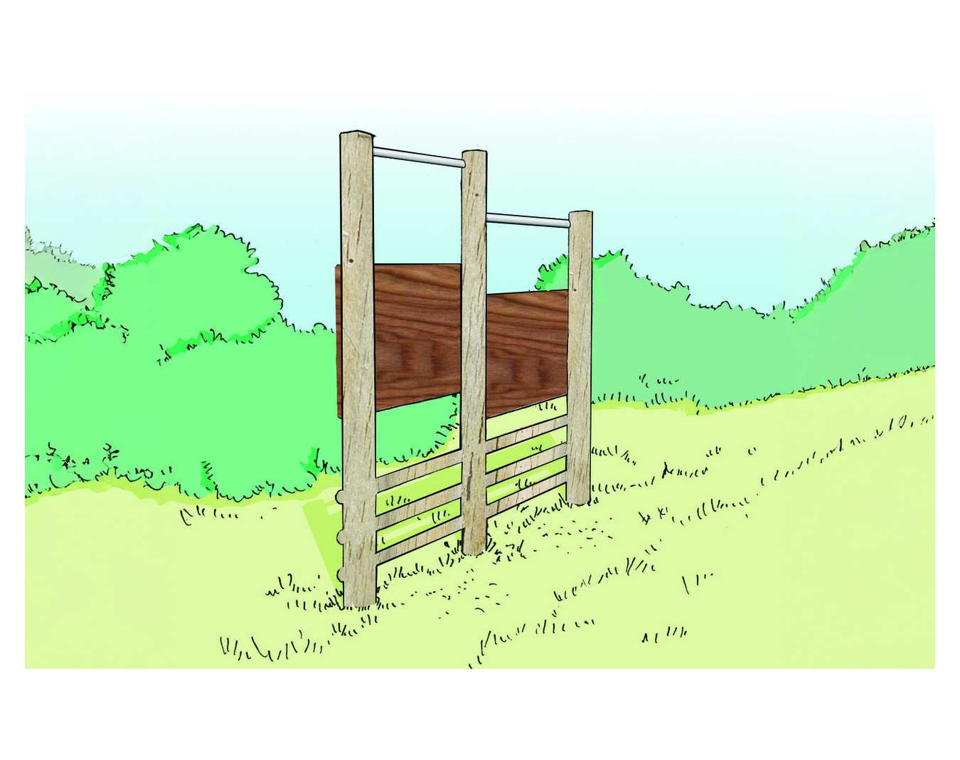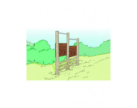 Poteaux en rondin Ø 100 mm, poutre verticale section 90 x 68 mm, barre supérieure en inox Ø 42,4 mm, dossier en compact ép. 10 mm.