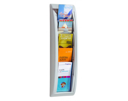 Présentoir mural. Structure et fenêtres en polystyrène choc ultra-resistant. Modèle 5 cases 1/3 A4. Dimensions : L. 18 x h. 65 cm. Profondeur : 9,5 cm. Épaisseur de case : 2 cm. Fixation par vis...