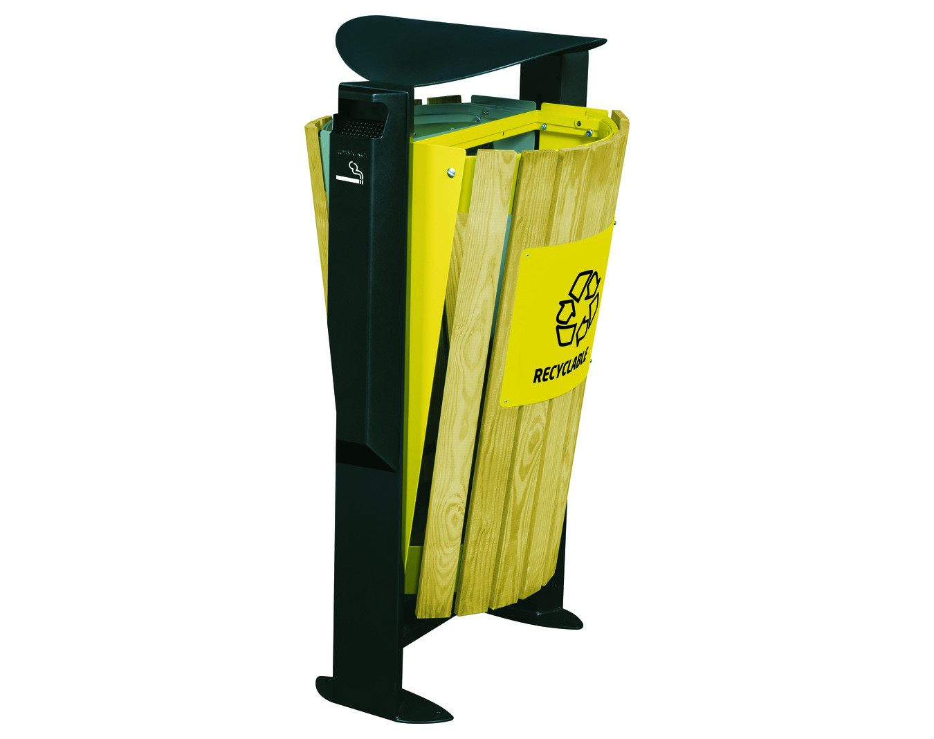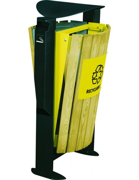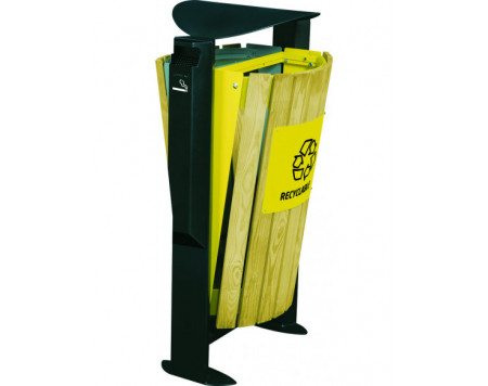 Poubelle urbaine tri sélectif. Acier traité anticorrosion et poudré anti-UV. Vidage par basculement de la façade vers l’avant (maintien par sangle). Façade avec lames en bois traité autoclave...