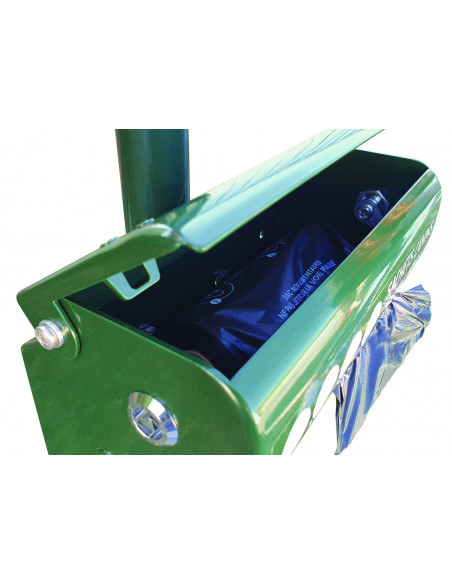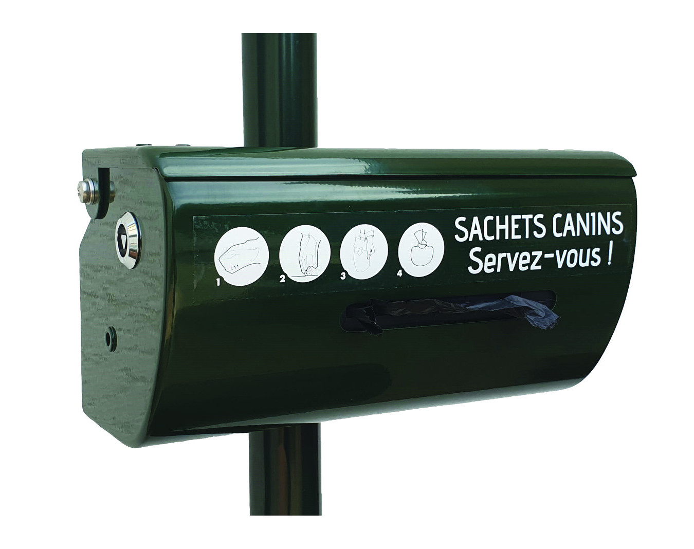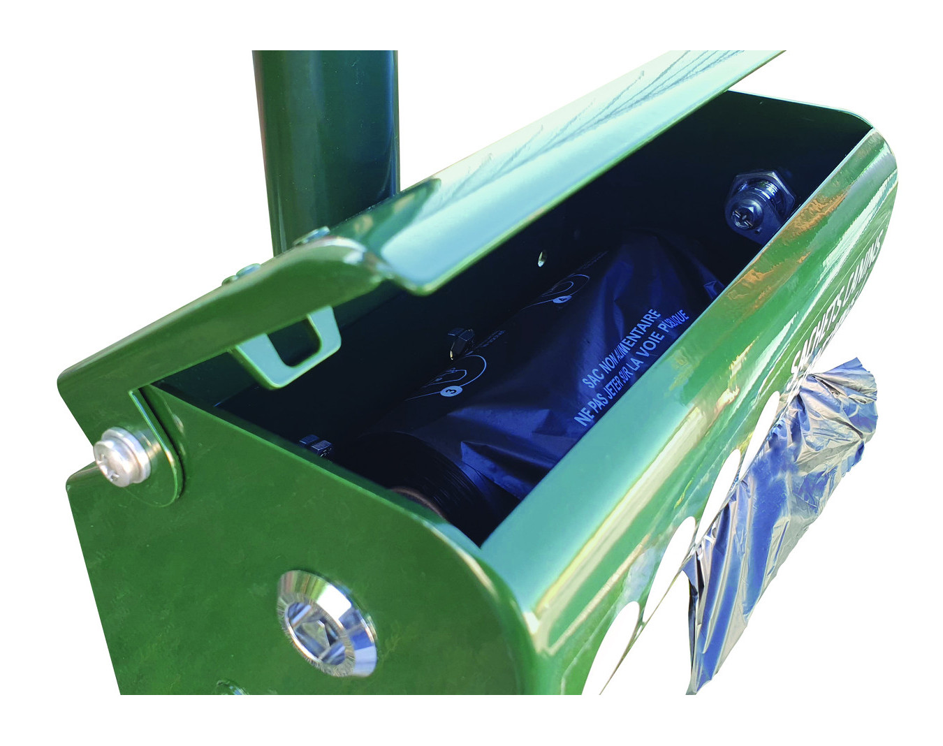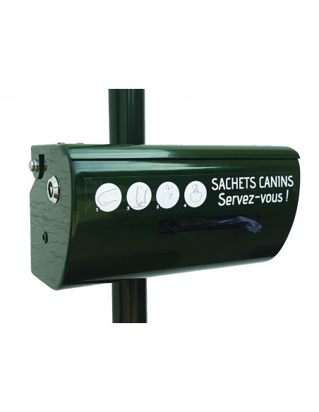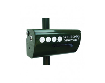 Distributeur de sacs canins. Structure en aluminium thermolaqué, coloris RAL 6009, autres coloris en option. Dimensions : 30 x 20 x 15 cm. Capacité : 1 rouleau de 200 sachets. Grâce au frein de...
