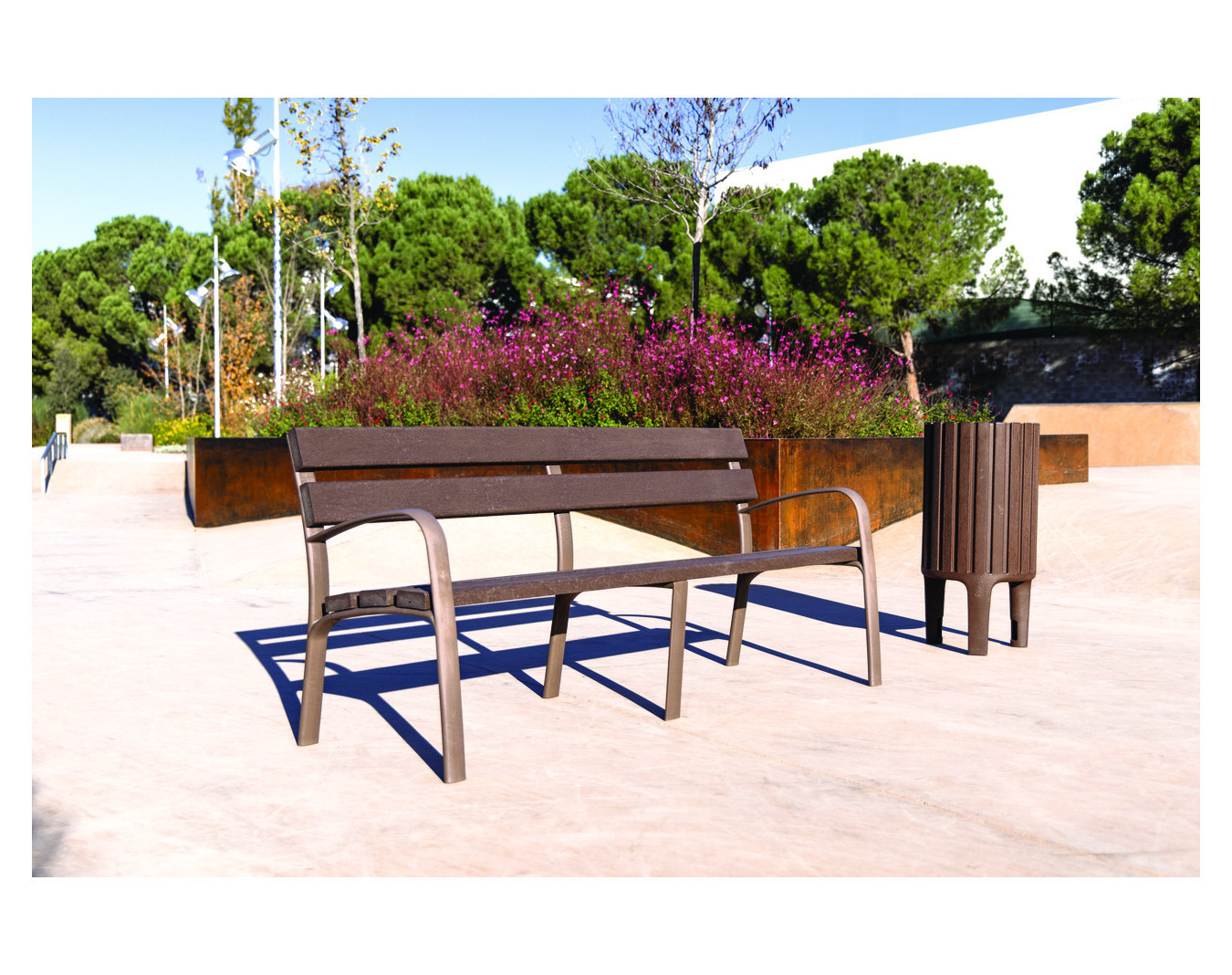 Banc de parc écologique avec lames en plastique recyclé, coloris marron.