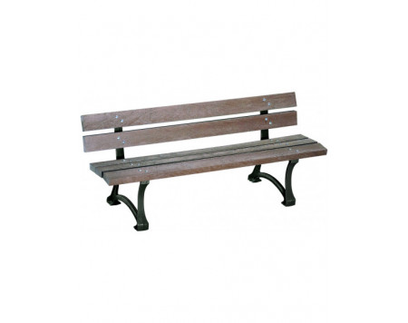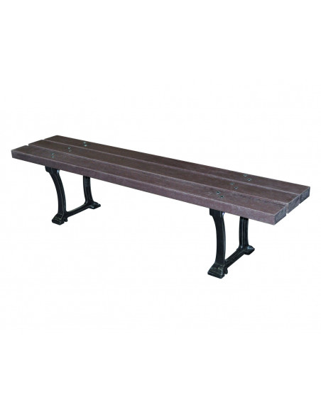Banc et banquette extérieurs pour collectivités. Lames 100 % plastique recyclé teinté dans la masse, coloris marron. Sans entretien, résistant aux UV, à l’humidité, à la corrosion, aux insectes...