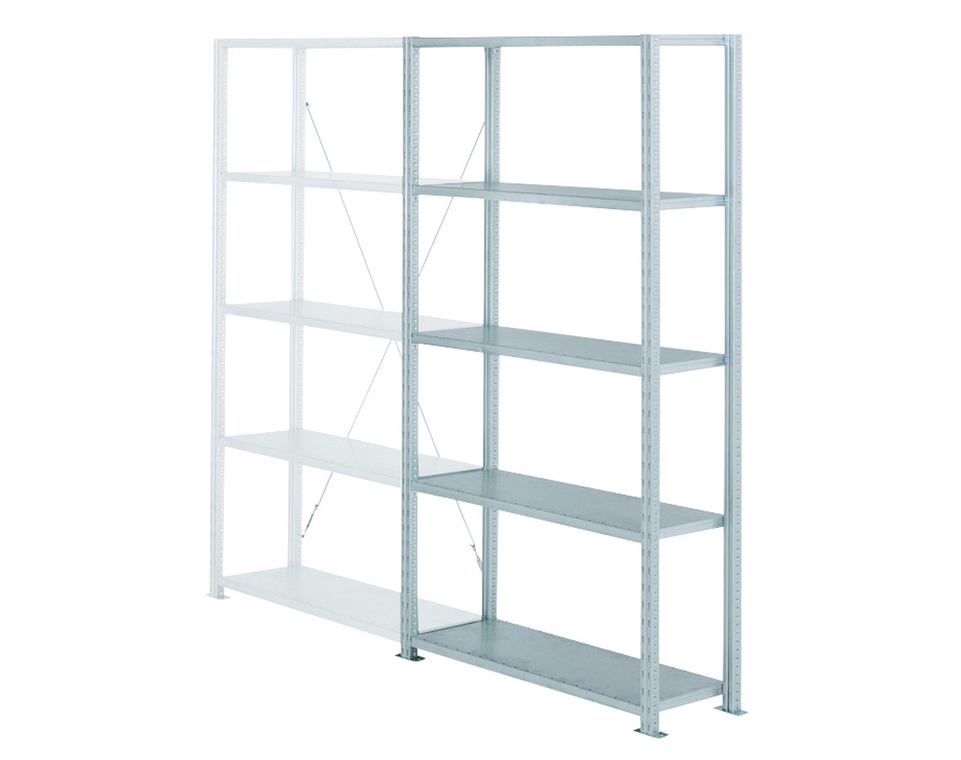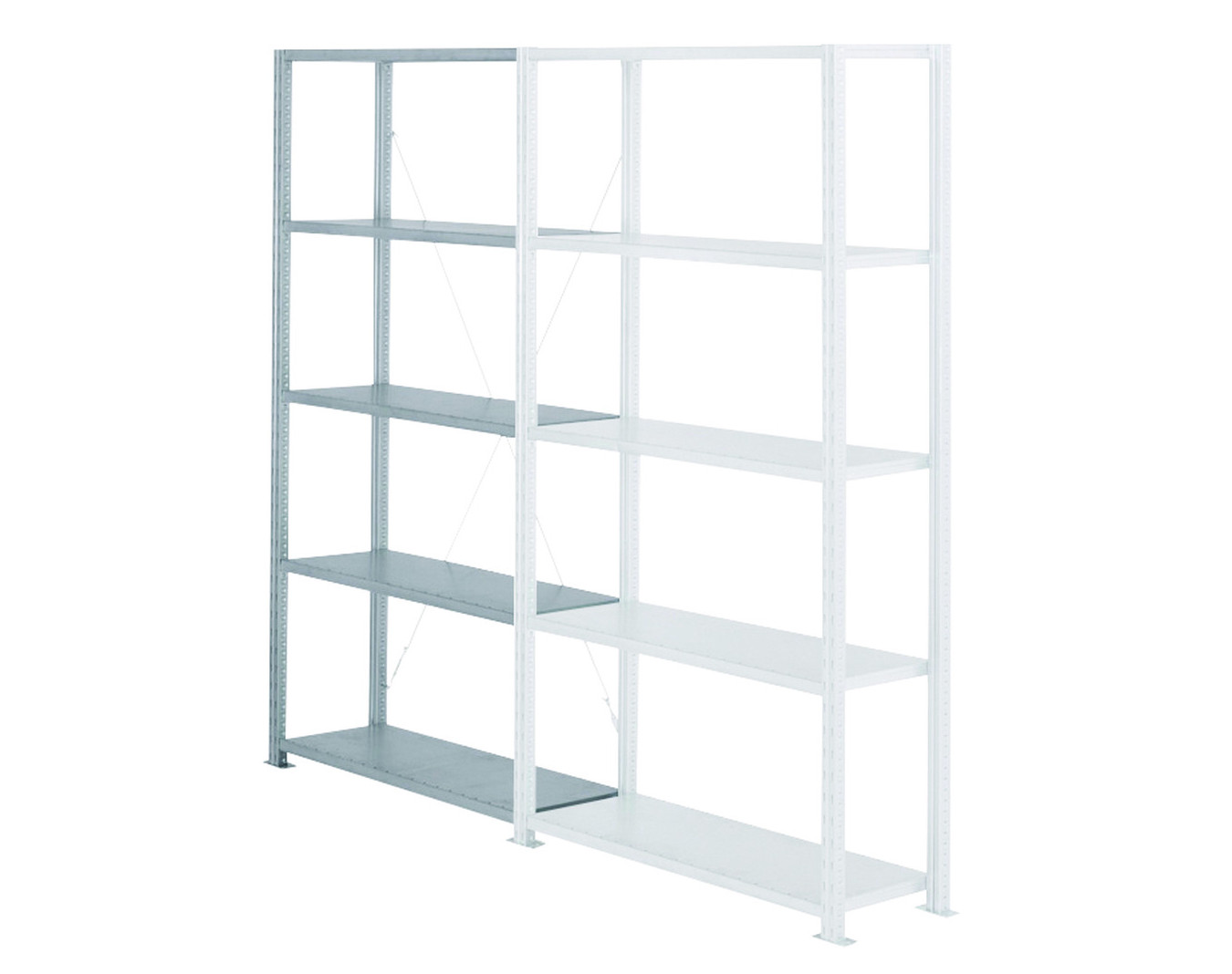 Montants en acier, profil en 43 x 39 mm, perforations latérales au pas de 25 mm pour le réglage des tablettes et perforations en façade de 50 mm pour l'accroche de croisillons (pour assurer la rigidité et la stabilité de l'ensemble) et autres accessoires.