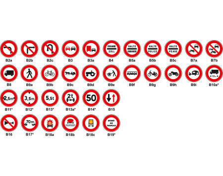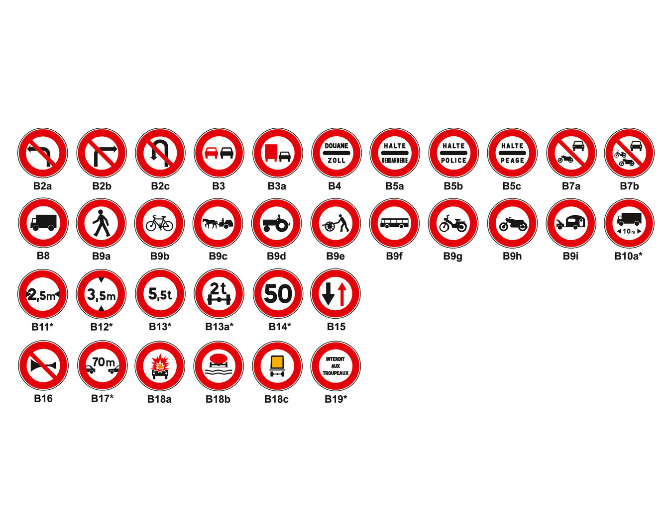 Panneaux B signalant une interdiction regroupent de nombreux panneaux indiquant une interdiction de tourner, de doubler, de klaxonner, un arrêt douane ou péage obligatoire, une interdiction d’accès à certains véhicules (poids-lourds, transport de produits polluants ou dangereux), aux piétons, aux cyclistes, ou aux véhicules dépassant une certaine longueur, hauteur ou poids, une interdiction de dépasser une vitesse, une obligation de céder le passage au véhicule venant en sens inverse ou de respecter une distance entre 2 véhicules…