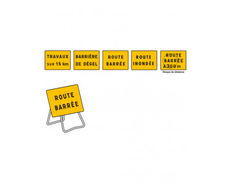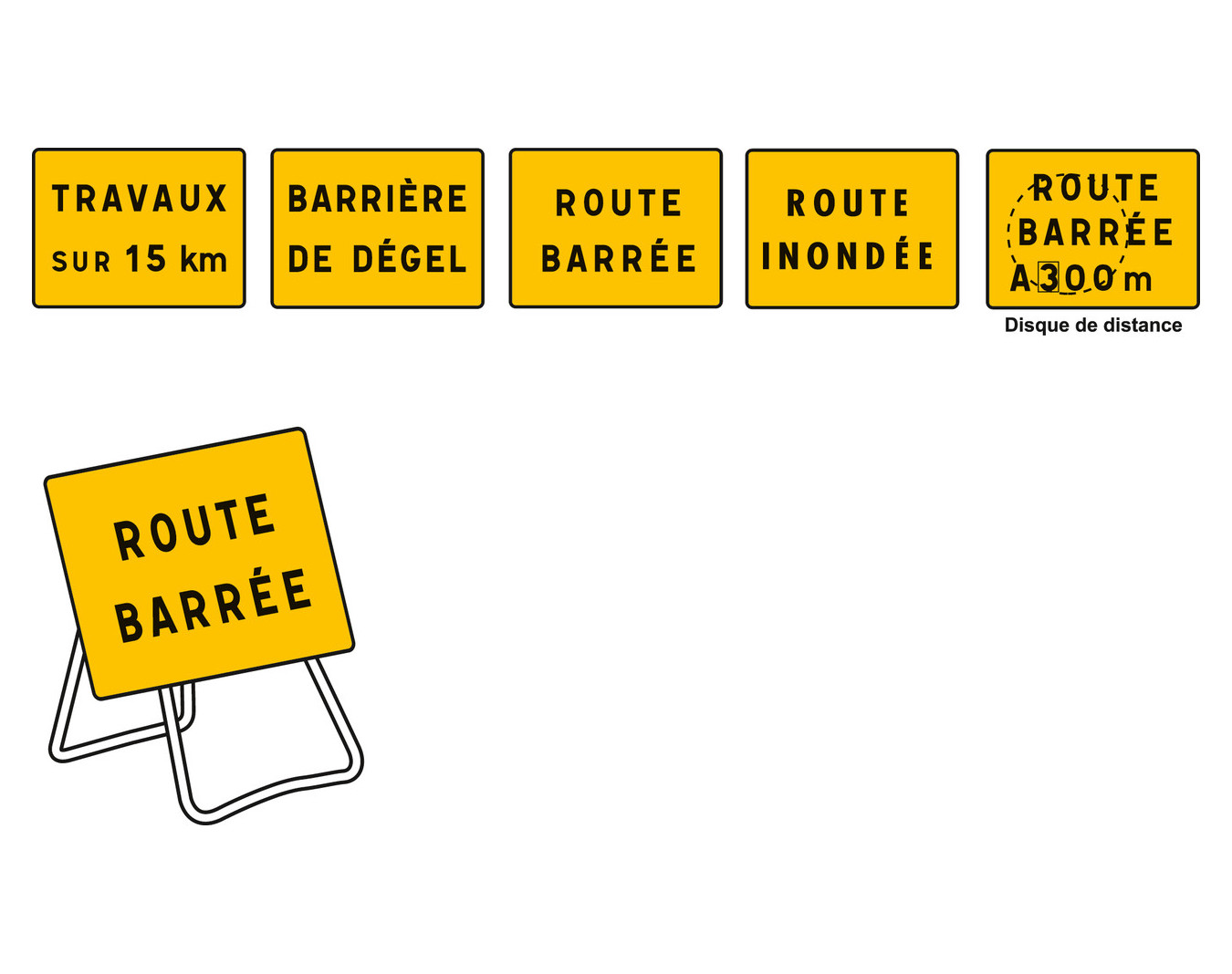 Les panneaux temporaires KC1 permettent de signaler un chantier. Ils regroupent les panneaux indiquant : une route barrée, une route inondée, une zone de travaux ou une barrière de dégel ce qui permet de limiter le tonnage.