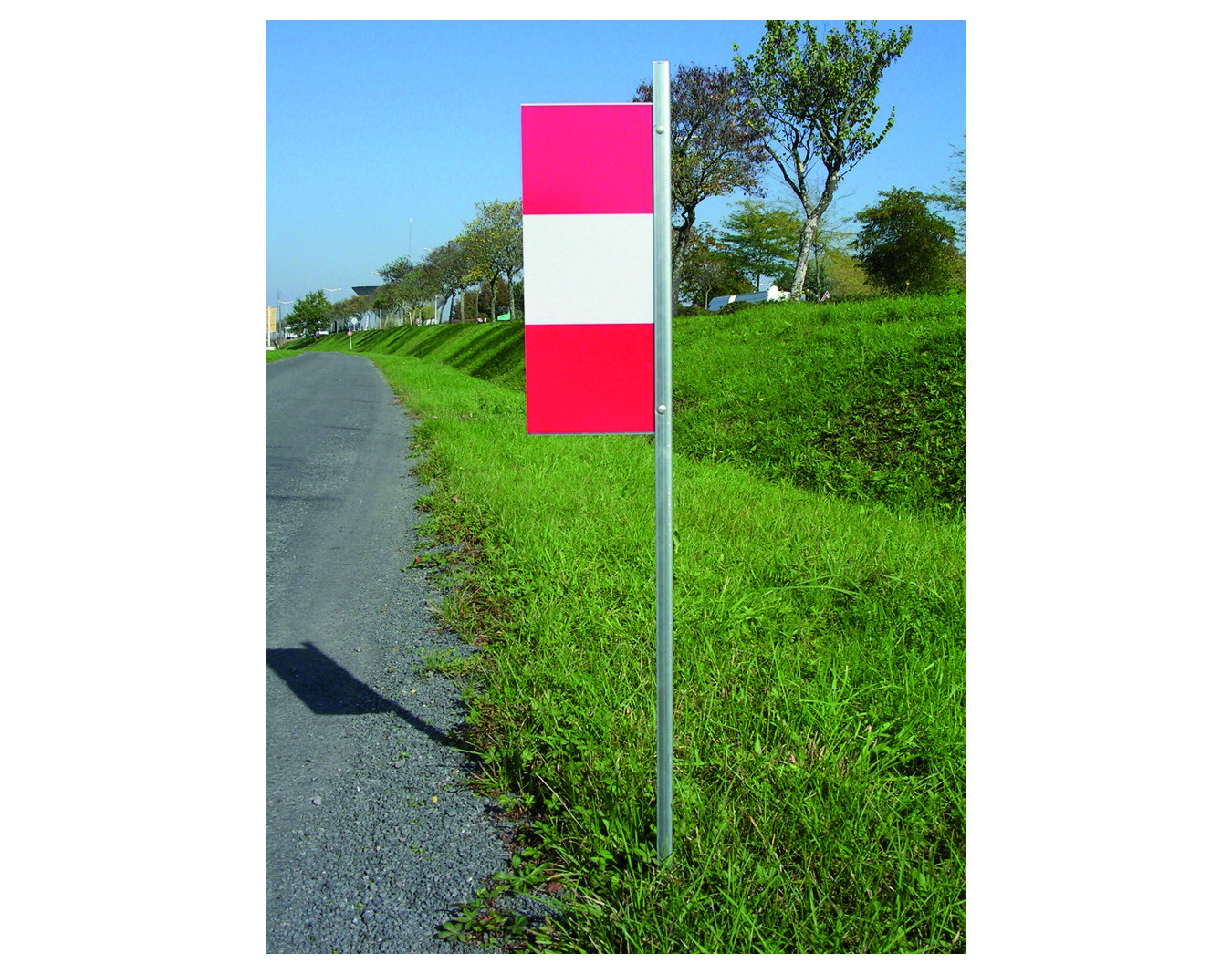 Piquet de chantier K5b double face. Platine et support en acier galvanisé. Plaque rétroréfléchissante 37,5 x 15 cm. Hauteur : 100 cm. Conditionnement par 10.