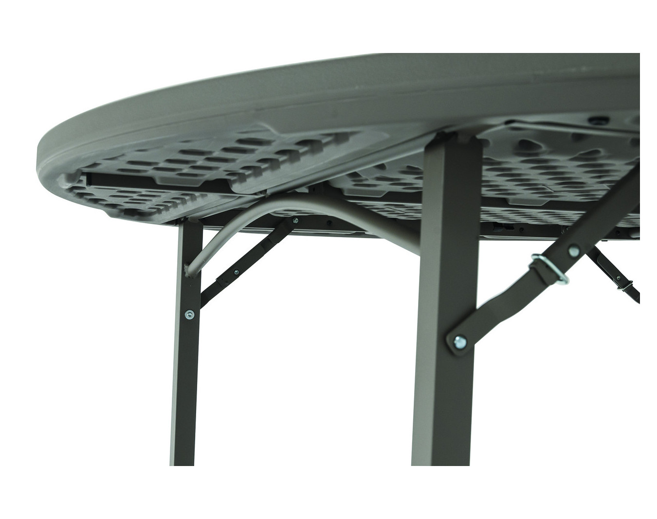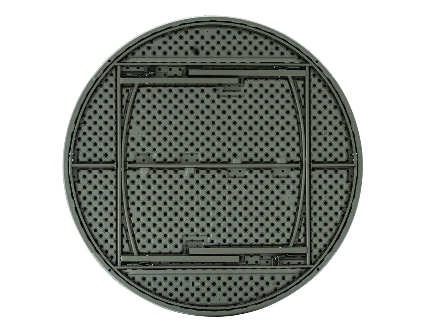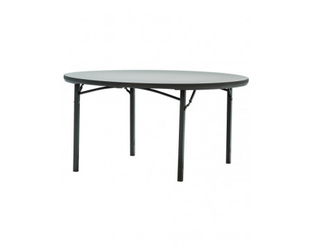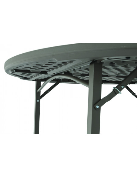 Table ronde. Piètement en acier tube carré 35 x 35 mm coloris gris foncé. Plateau en polyéthylène haute densité épaisseur 50 mm (modèles 6 et 8 places), 55 mm (modèle 10 places) traité anti-UV et...