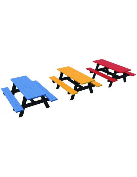Table extérieure de pique-nique pour collectivités. 100 % plastique recyclé, teinté dans la masse. Sans entretien, résistant aux UV, à l’humidité, à la corrosion, aux insectes et anti graffitis....