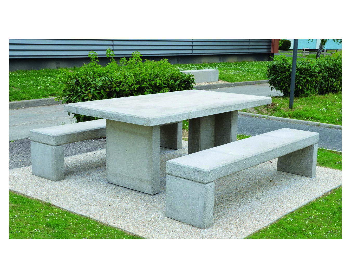 Table de pique-nique en béton blanc avec plateau avec dessus lisse et traitement anti-tâches, finition blanc sablé et piètement et assises finition sablée ton pierre ; ou en béton gris sablé....