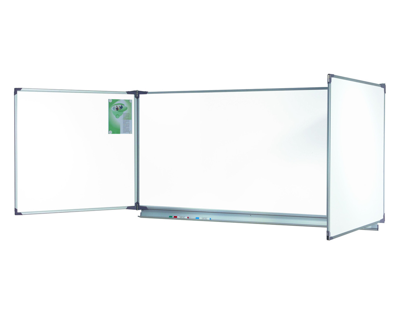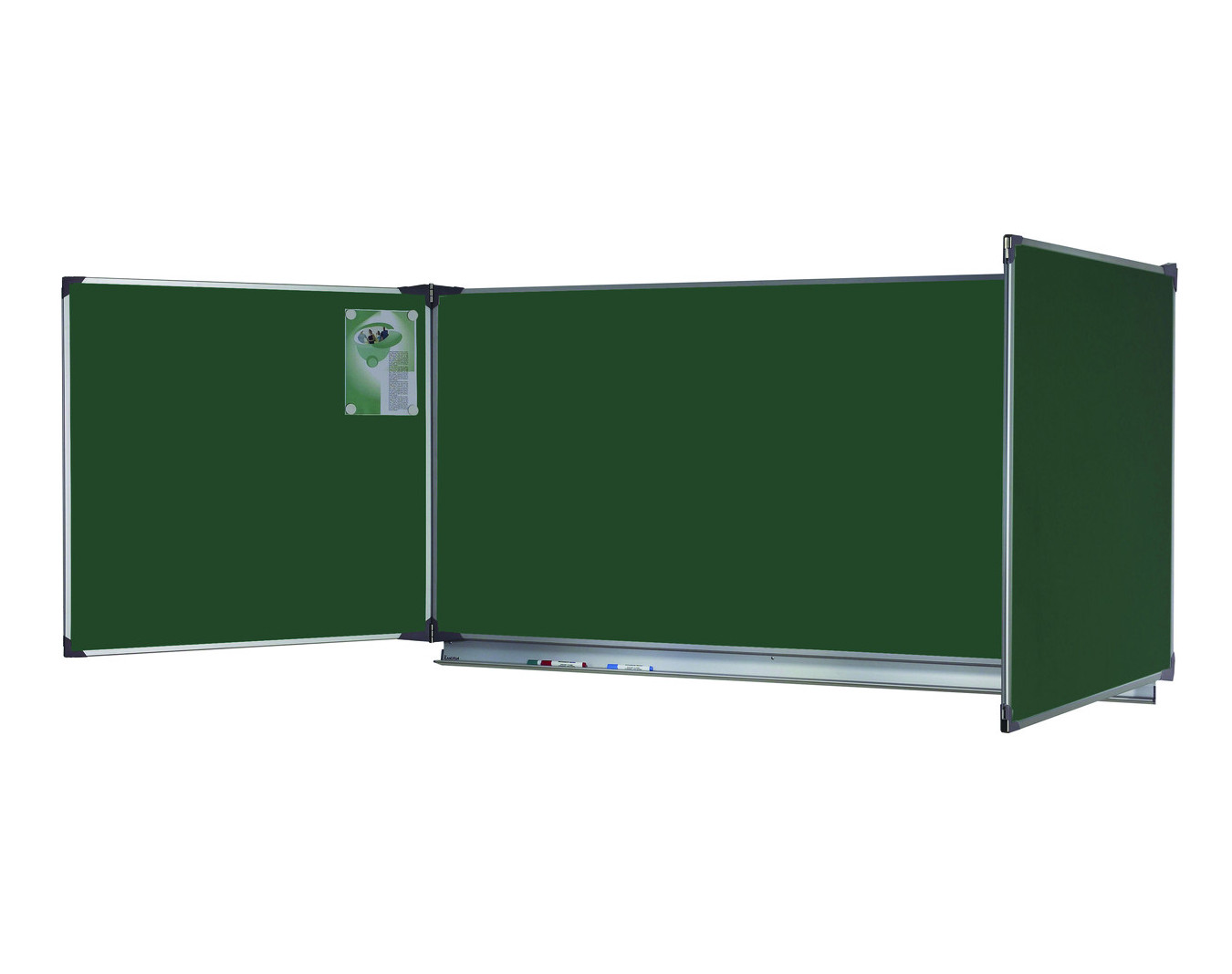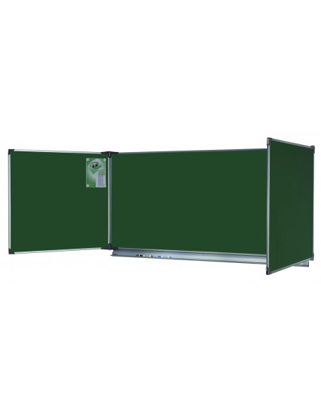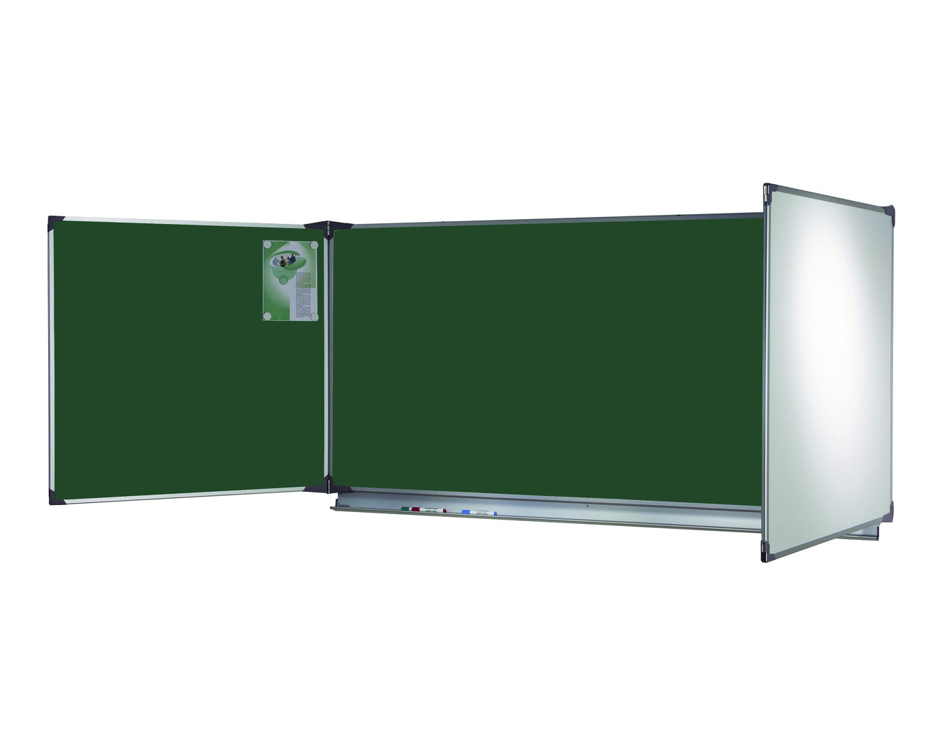 En partie basse, un auget en aluminium anodisé sur toute la longueur du panneau central ; en partie haute, crochets porte-cartes intégrés dans le profil supérieur.