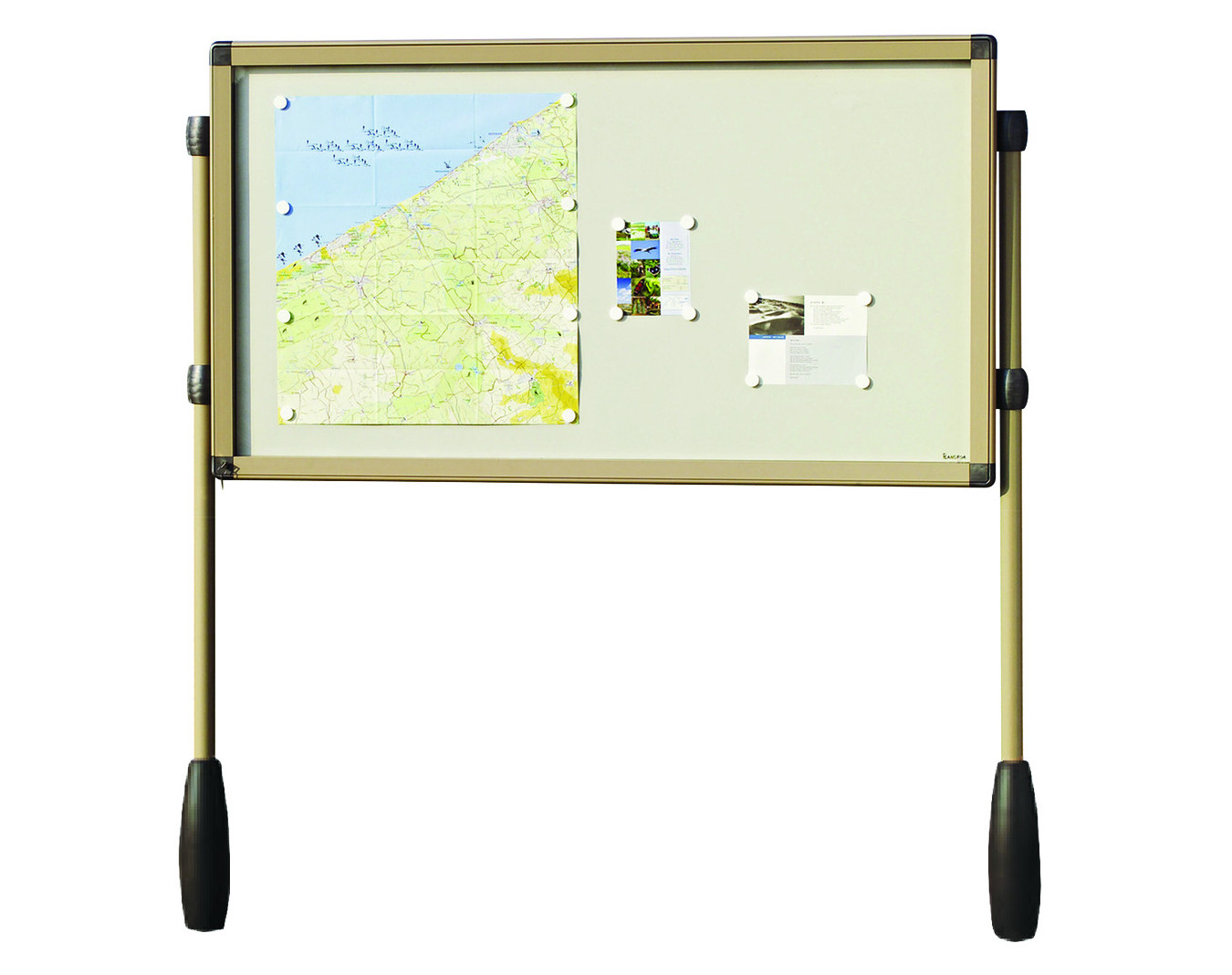 Vitrine extérieure sur pieds. Encadrement en alu laqué polyester (voir nuancier) avec coins arrondis coloris gris RAL 9023. Étanchéité assurée par un joint élastomère avec circulation d'air...