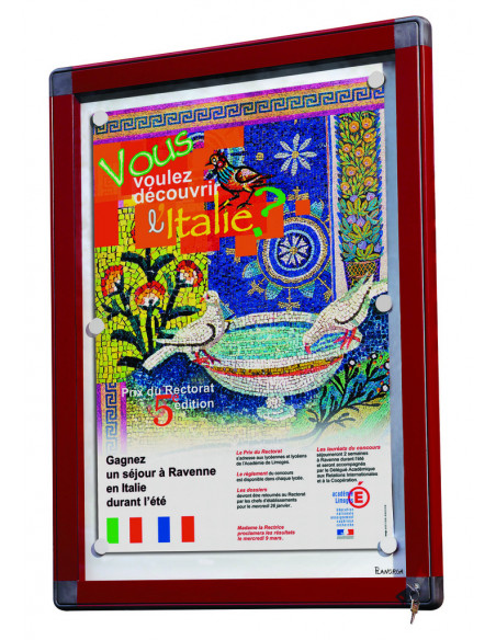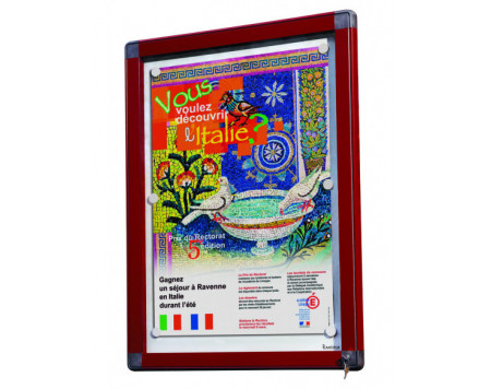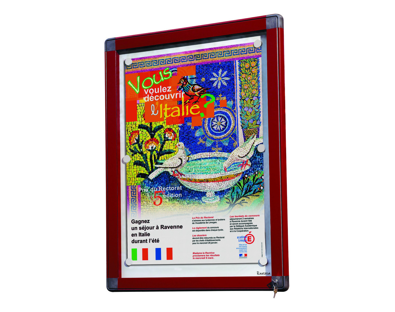 Vitrine d'affichage extérieur. Encadrement en aluminium anodisé naturel ou alu laqué polyester (voir nuancier) avec coins arrondis coloris gris RAL 9023. Vitre en PMMA, ép. 4 mm. Fond tôle gris RAL...