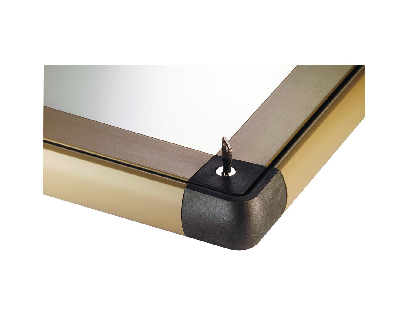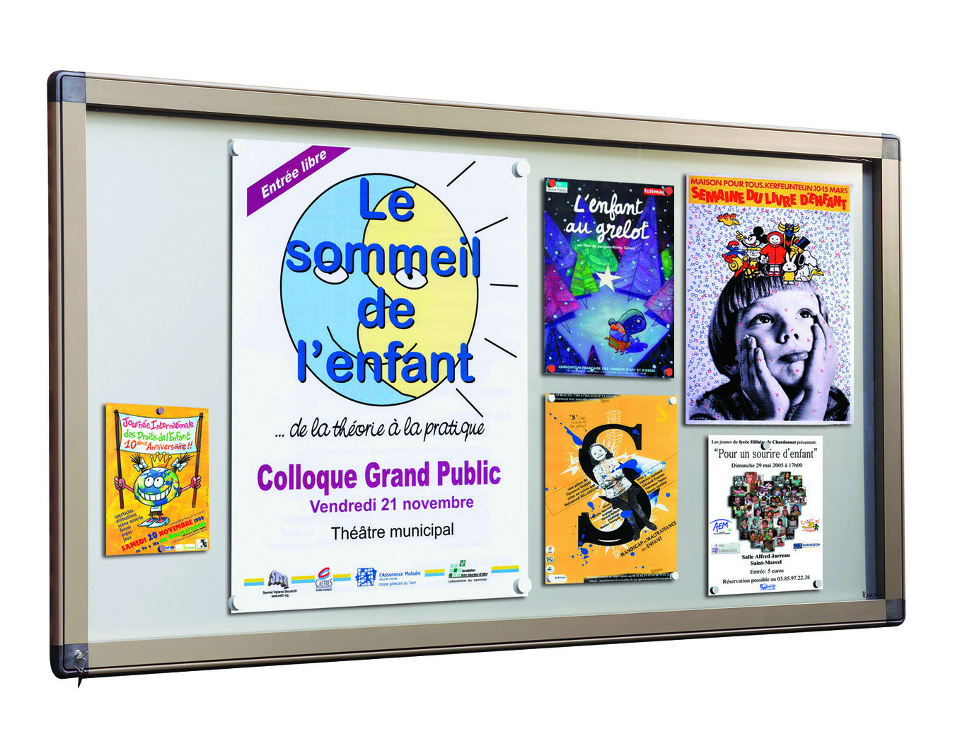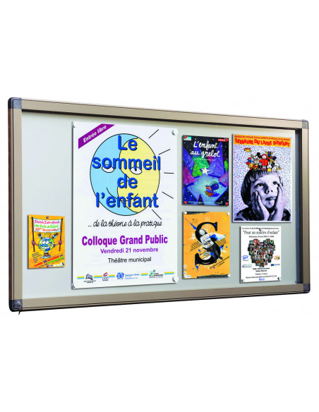 Vitrine d'affichage extérieur grand format. Encadrement en aluminium anodisé naturel ou alu laqué polyester (voir nuancier) avec coins arrondis coloris gris RAL 9023. Étanchéité assurée par un...