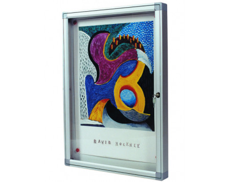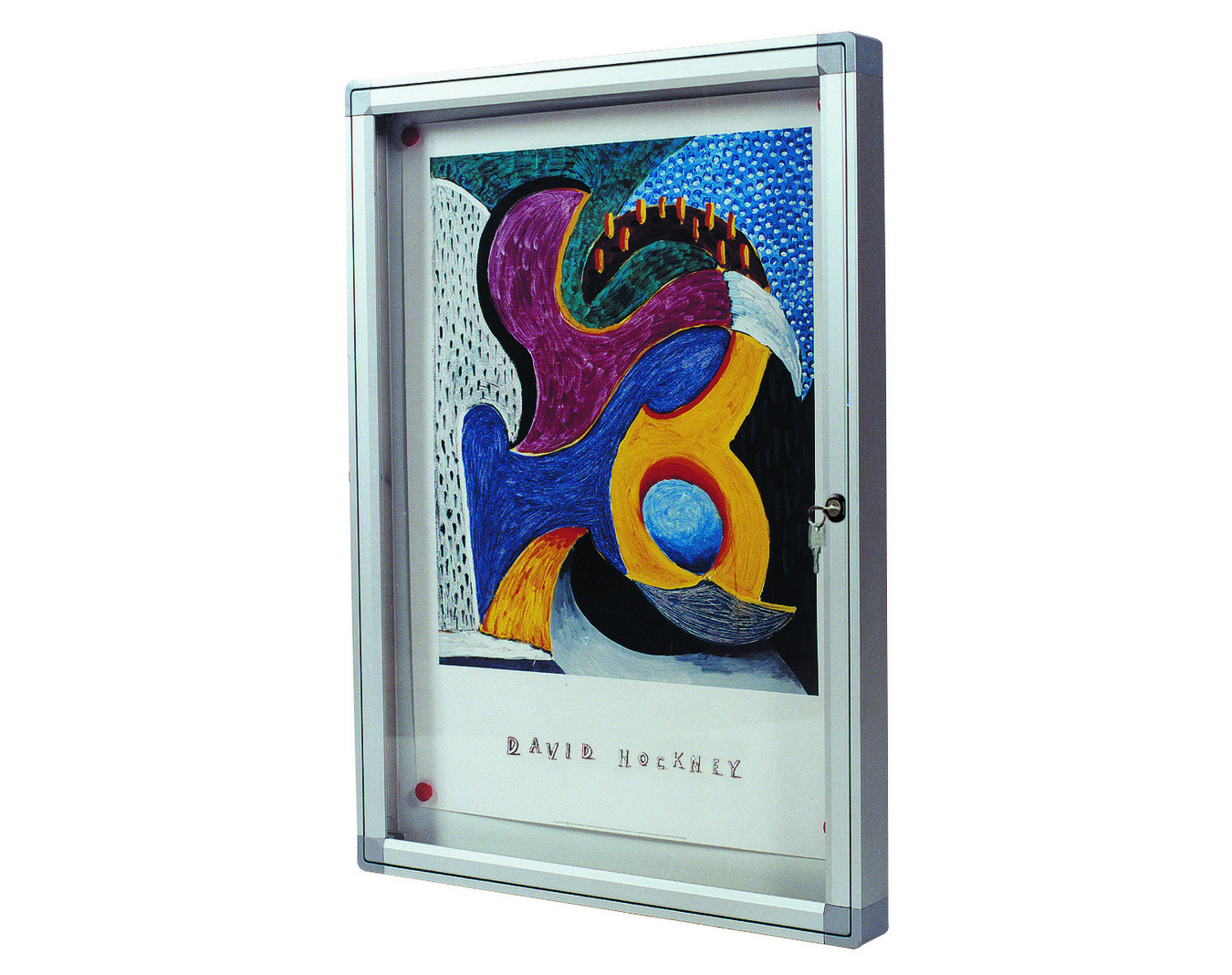 Vitrine 2000. Encadrement en aluminium anodisé naturel avec angles arrondis. Vitre en plexichocs, ép. 4 mm. Fond magnétique en tôle galvanisée coloris blanc. Dimensions disponibles : de 9 à 30 A4....