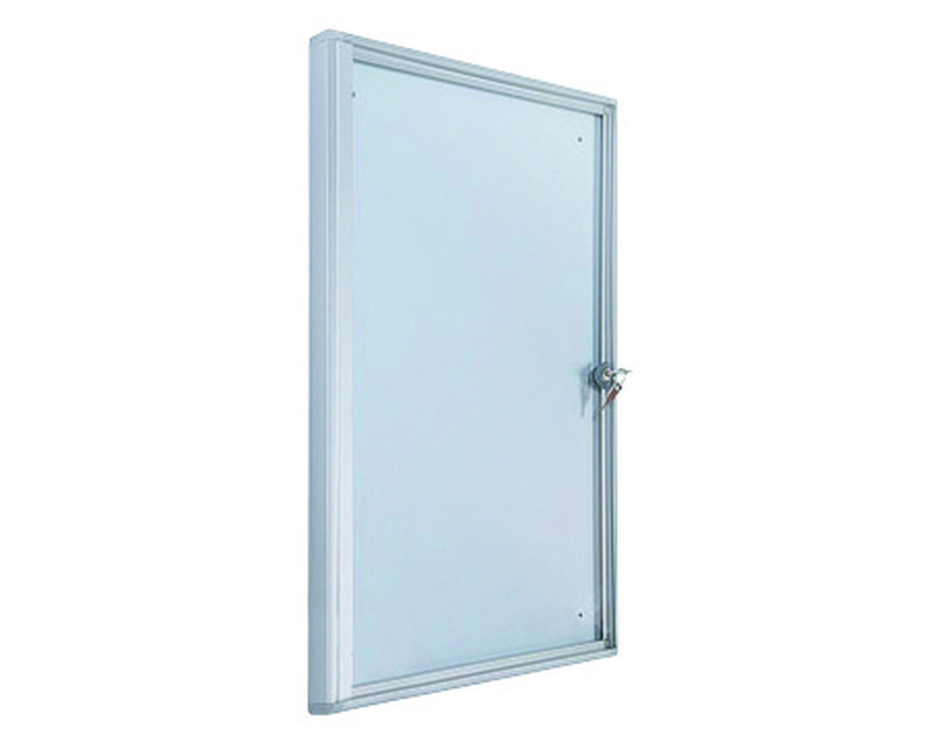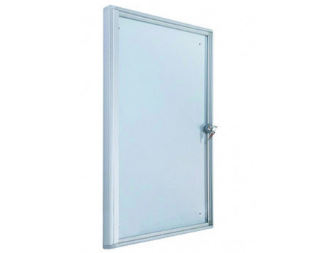 Vitrine affichage professionnel. Encadrement en aluminium anodisé avec angles en plastique gris clair. Vitre en plexiglas, ép. 3 mm. Fond en tôle laquée blanc pour affichage magnétique (fond liège...