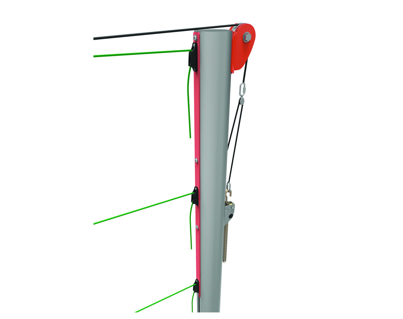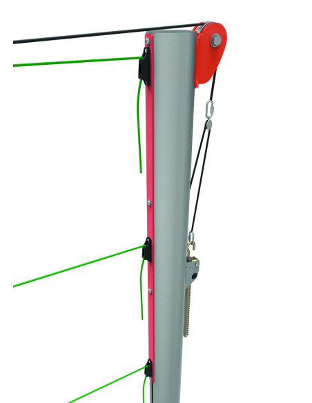 Système de tension par treuil et cabestan ou double cabestan à l’extérieur des poteaux.